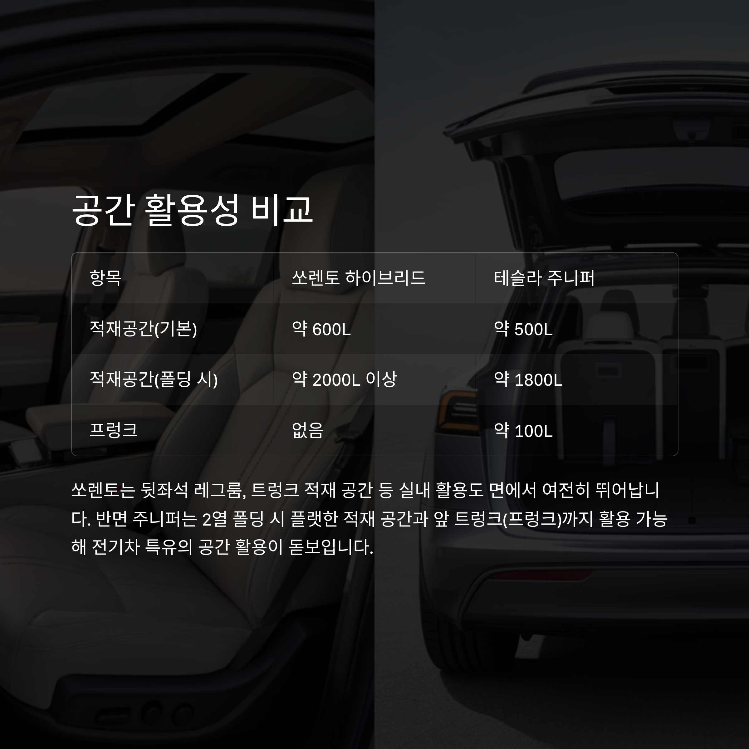 쏘렌토 하이브리드는 연비 좋고 공간 넉넉한 SUV로 패밀리카의 대명사였습니다. 하지만 최근 테슬라의 새로운 프로젝트, 주니퍼 모델로 차량을 교체하는 사례가 늘고 있습니다. 연비와 효율에서 전기차의 매력을 느낀 분들이라면 더욱 관심이 갈 수밖에 없습니다. 이번 글에서는 실제 오너의 경험을 토대로 왜 갈아탔는지, 두 차량의 실사용 비교는 어떤지 솔직하게 풀어보겠습니다.