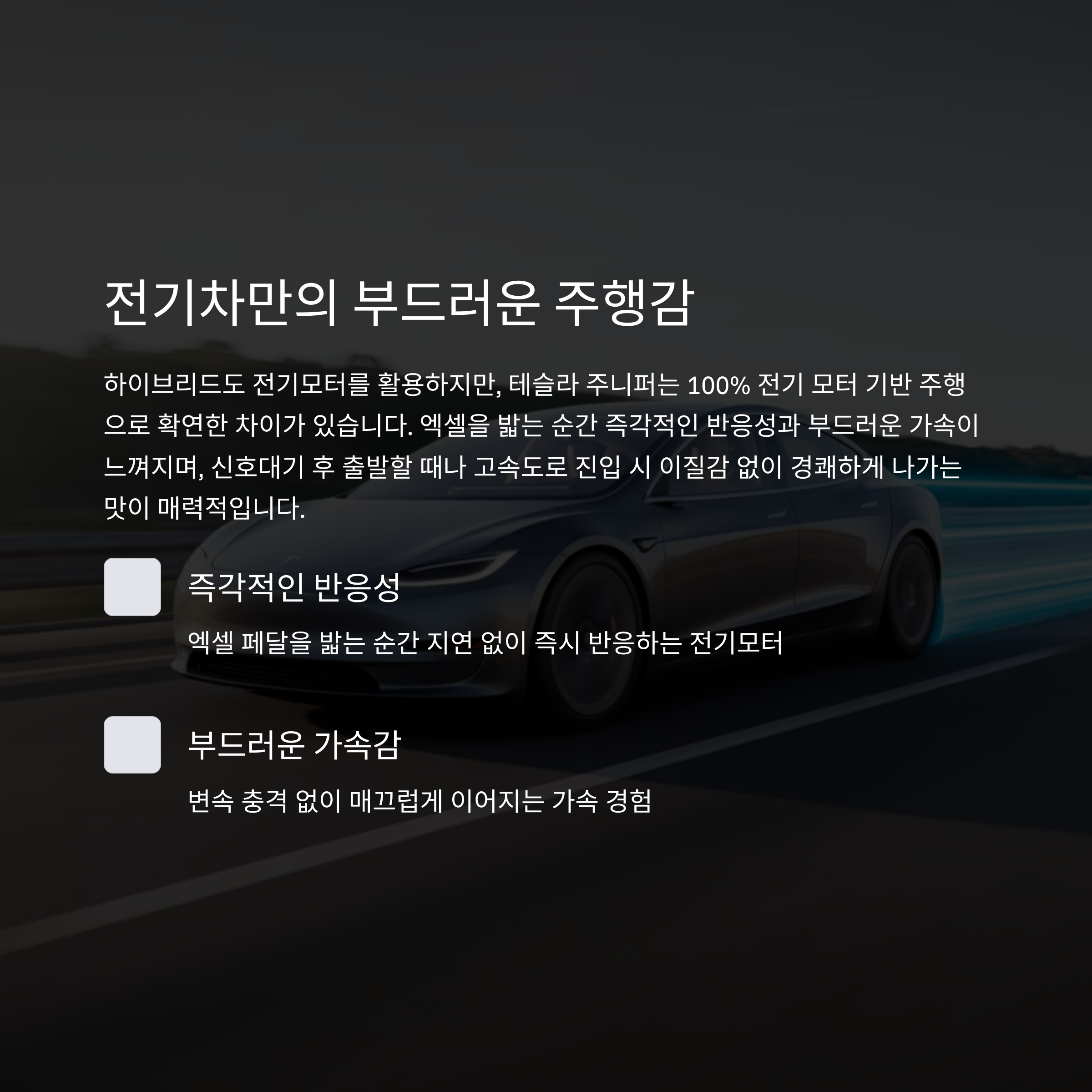 테슬라 주니퍼는 100% 전기 모터 기반 주행이라