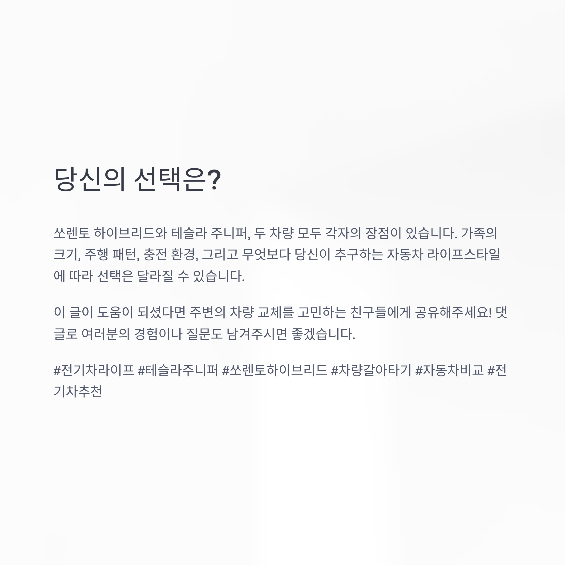 쏘렌토 하이브리드는 연비 좋고 공간 넉넉한 SUV로 패밀리카의 대명사였습니다. 하지만 최근 테슬라의 새로운 프로젝트, 주니퍼 모델로 차량을 교체하는 사례가 늘고 있습니다. 연비와 효율에서 전기차의 매력을 느낀 분들이라면 더욱 관심이 갈 수밖에 없습니다. 이번 글에서는 실제 오너의 경험을 토대로 왜 갈아탔는지, 두 차량의 실사용 비교는 어떤지 솔직하게 풀어보겠습니다.