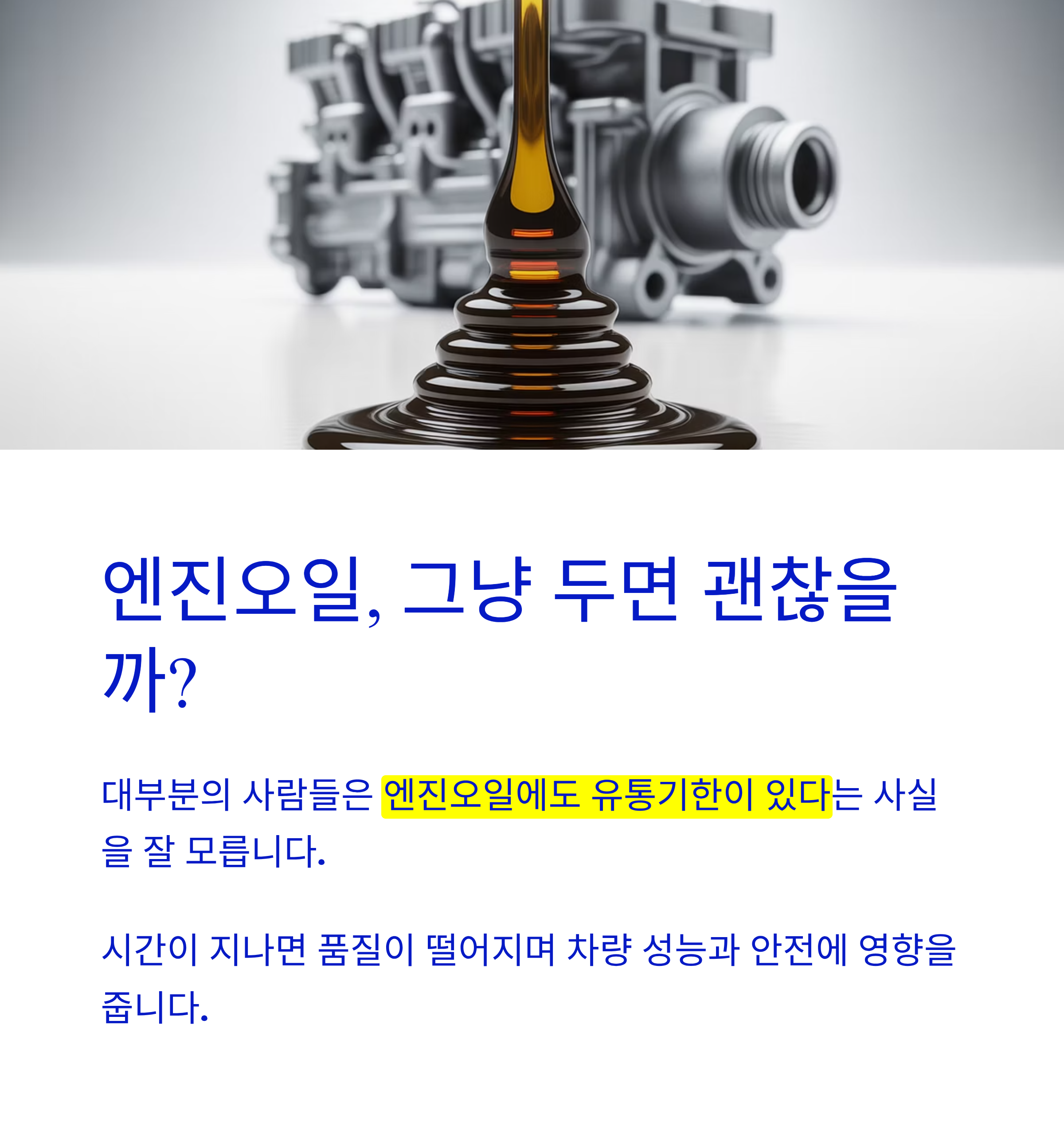 자동차를 소유하고 있다면 꼭 챙겨야 하는 것이 바로 엔진오일입니다. 그런데 대부분의 사람들은 '엔진오일에도 유통기한이 있다'는 사실을 잘 모르고 있습니다. 오일은 그냥 두면 안 변할 거라고 생각하기 쉬운데요, 실제로는 시간이 지나면 품질이 떨어지며 차량 성능과 안전에 영향을 줄 수 있습니다. 오늘은 엔진오일의 유통기한과 이를 지나쳤을 때 생길 수 있는 다양한 문제들에 대해 알아보겠습니다.
