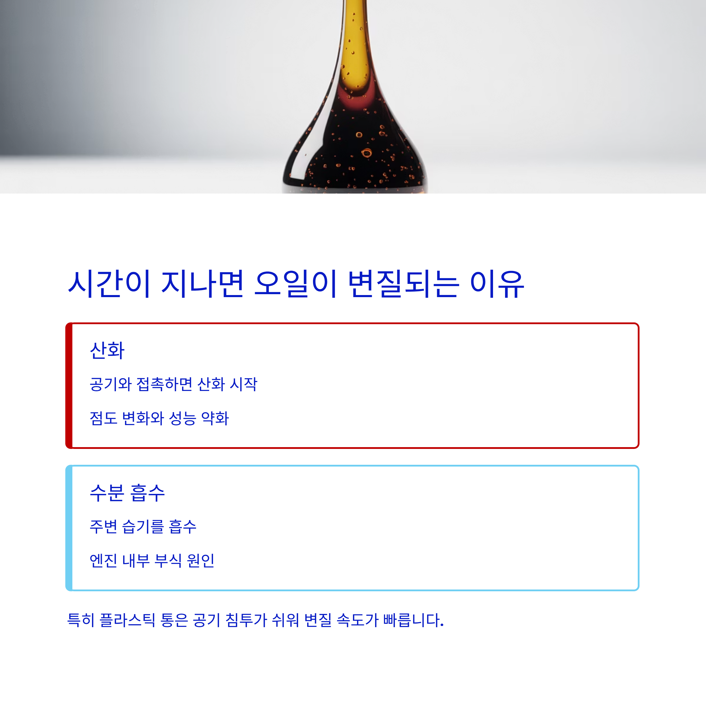 오일이 변질되는 주된 이유는 산화와 수분 흡수입니다.
