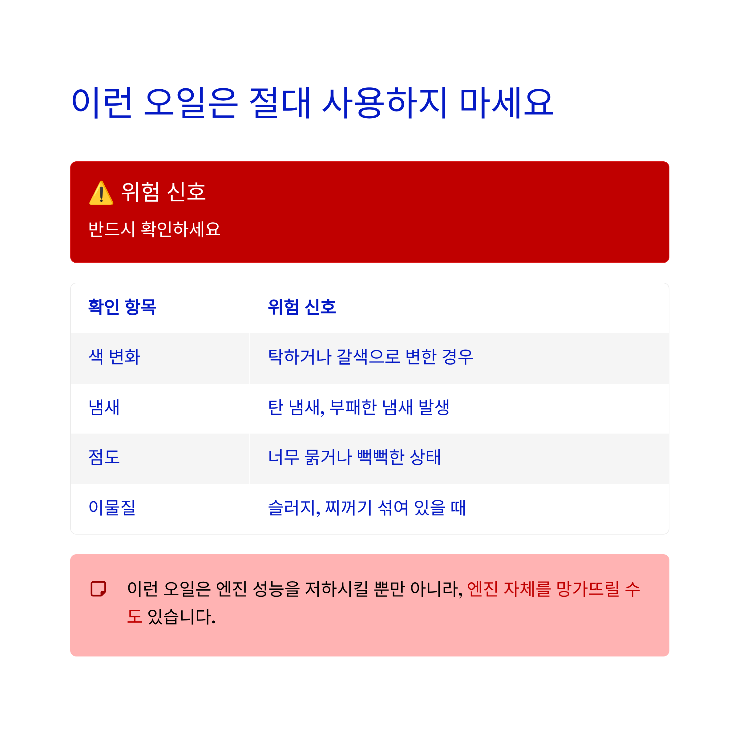 이런 오일은 엔진 성능을 저하시킬 뿐만 아니라, 엔진 자체를 망가뜨릴 수도 있습니다.