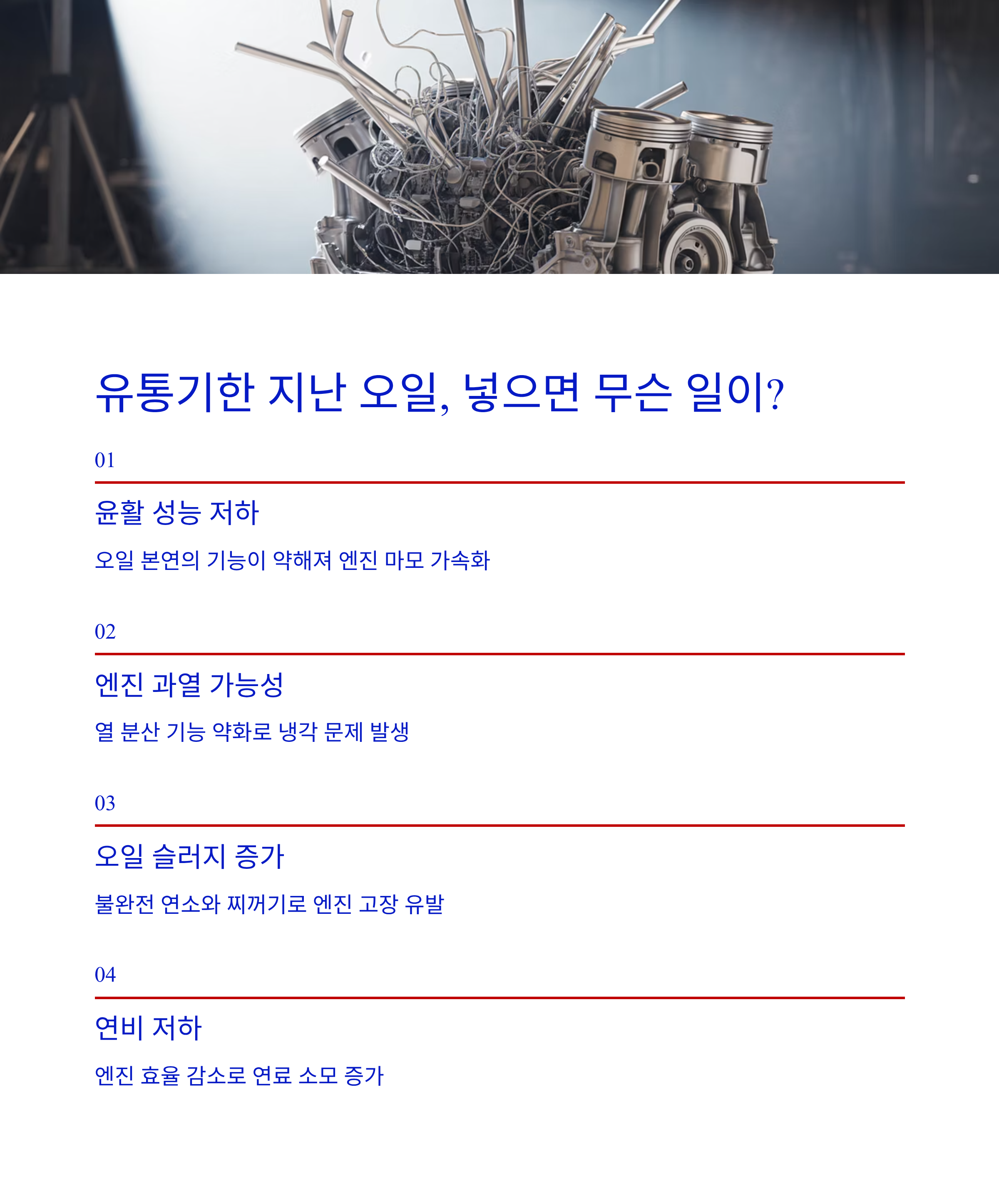 만약 유통기한이 지난 엔진오일을 차량에 주입한다면, 다음과 같은 문제가 발생할 수 있습니다.