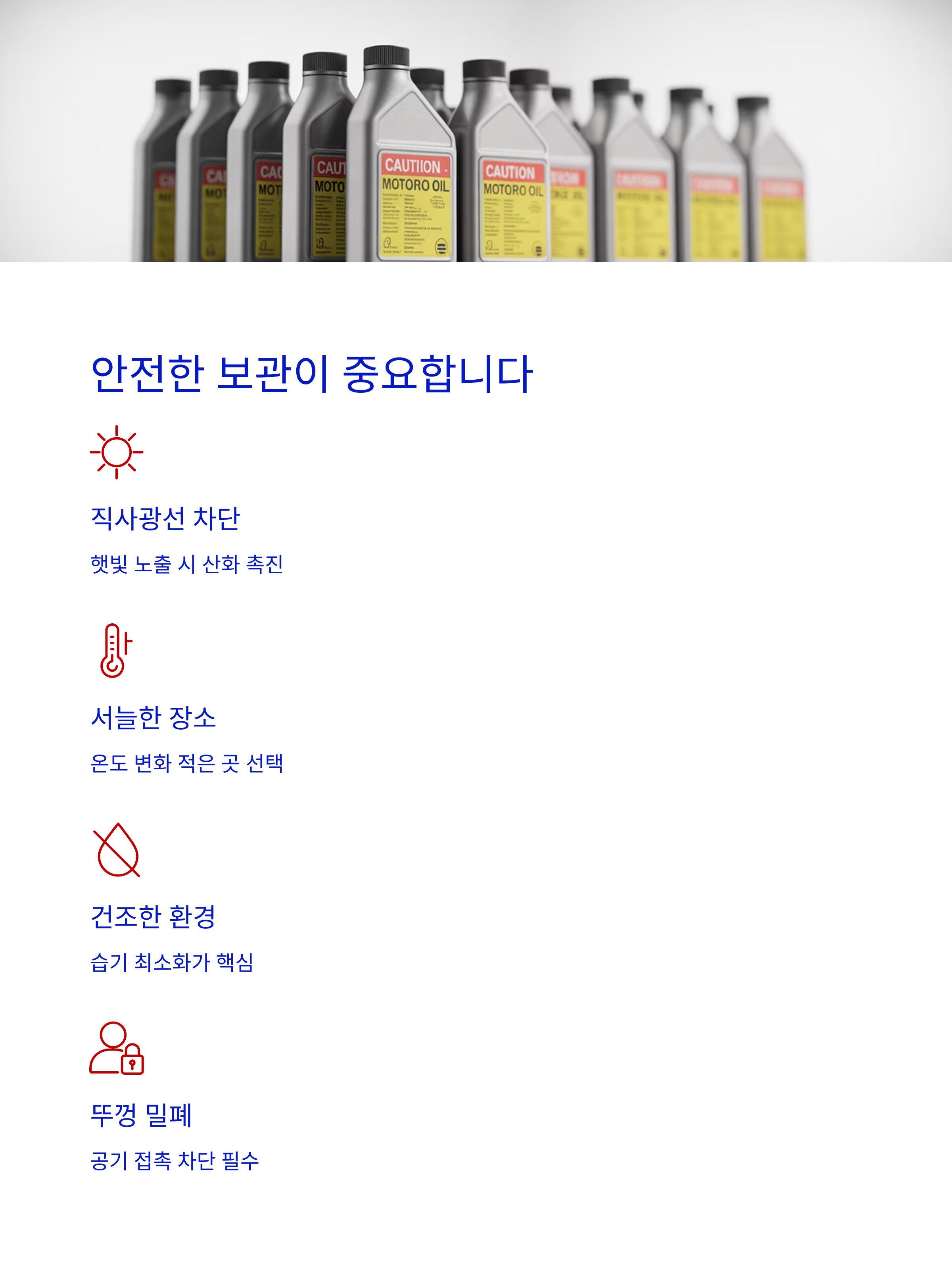 특히 플라스틱 통에 담긴 오일은 공기와 조금이라도 접촉되면 산화가 시작되며, 이로 인해 점도가 변하고 성능이 약화됩니다.