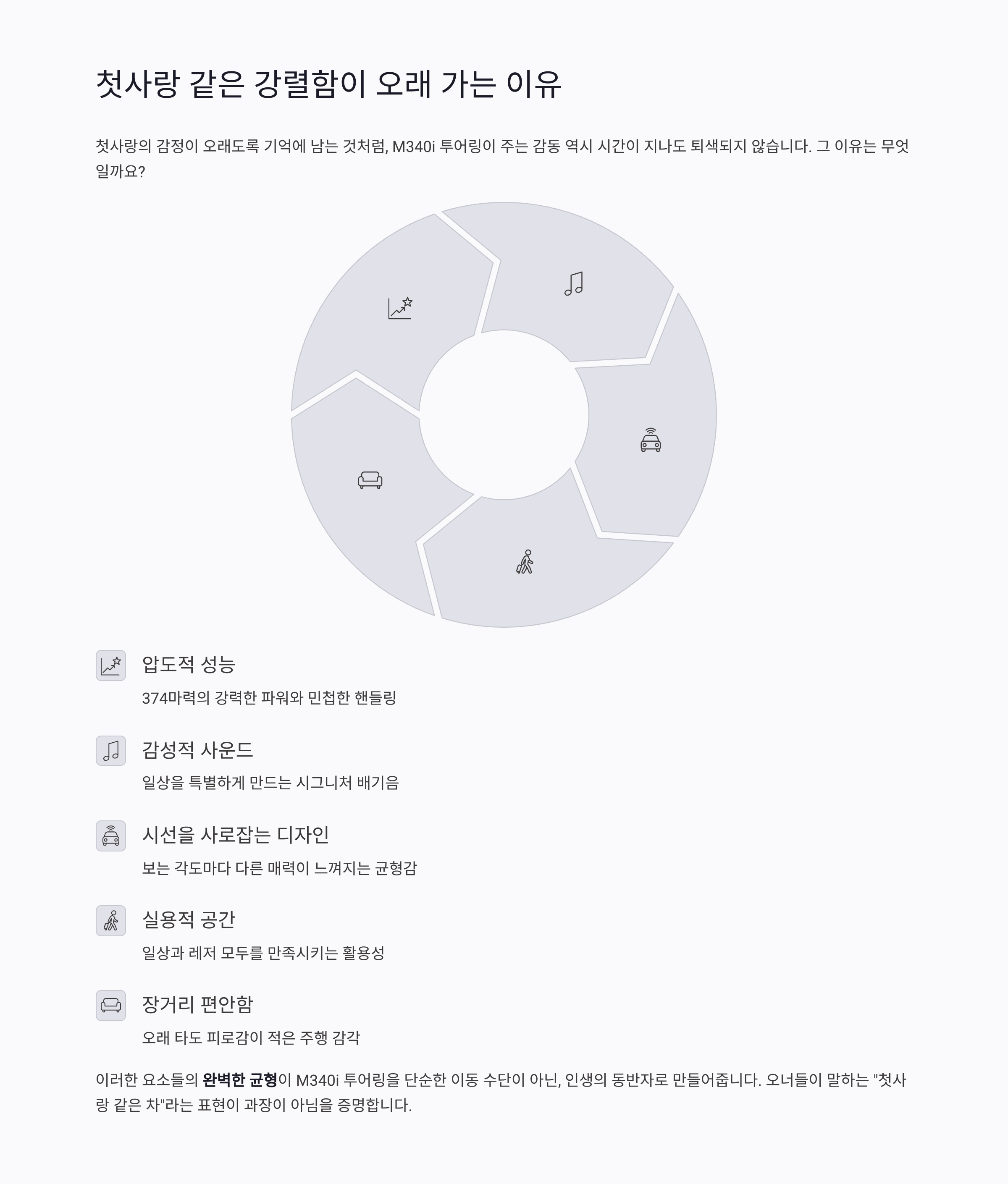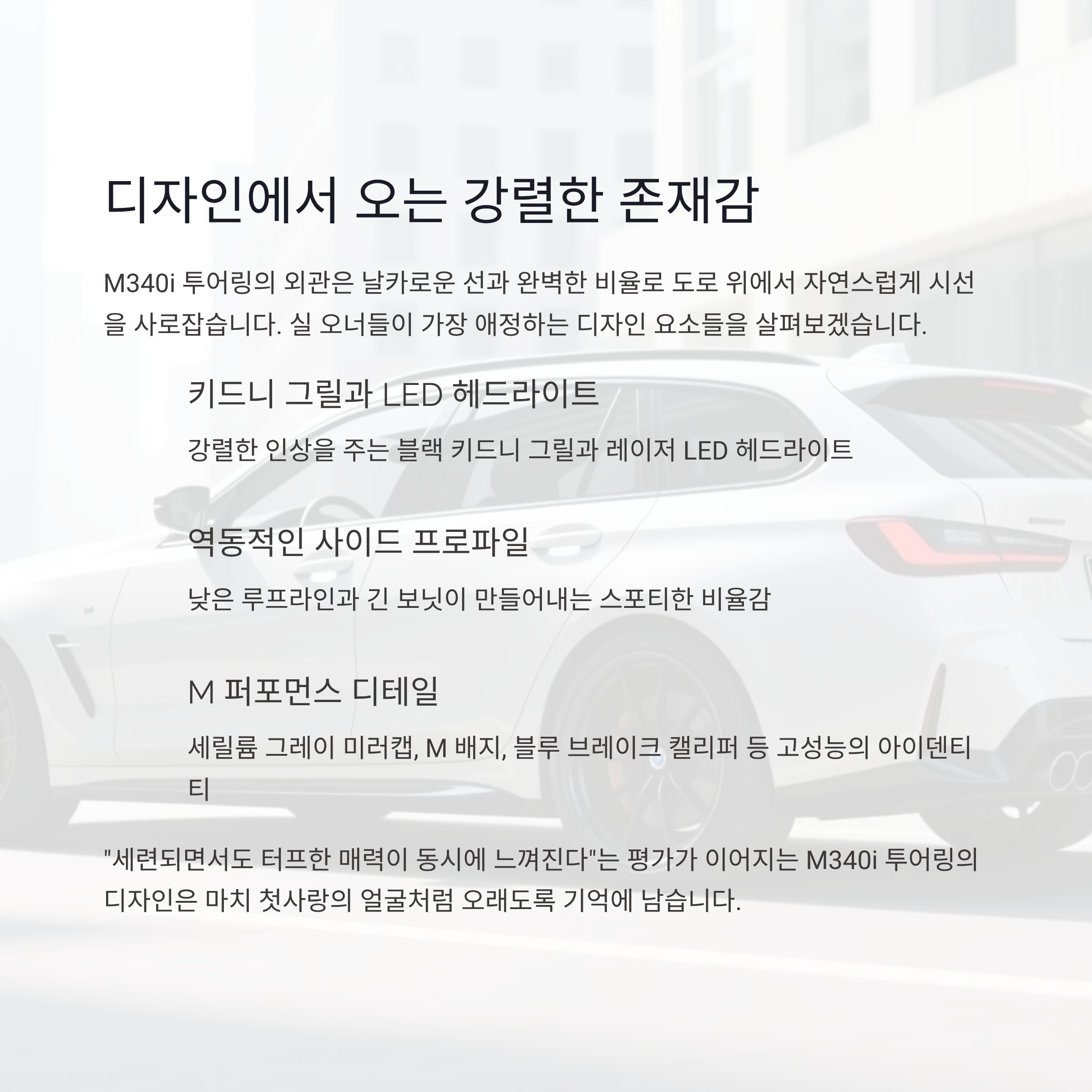 M340i 투어링 역시 첫 만남의 충격적인 감정을 오래도록 간직하게 만듭니다.