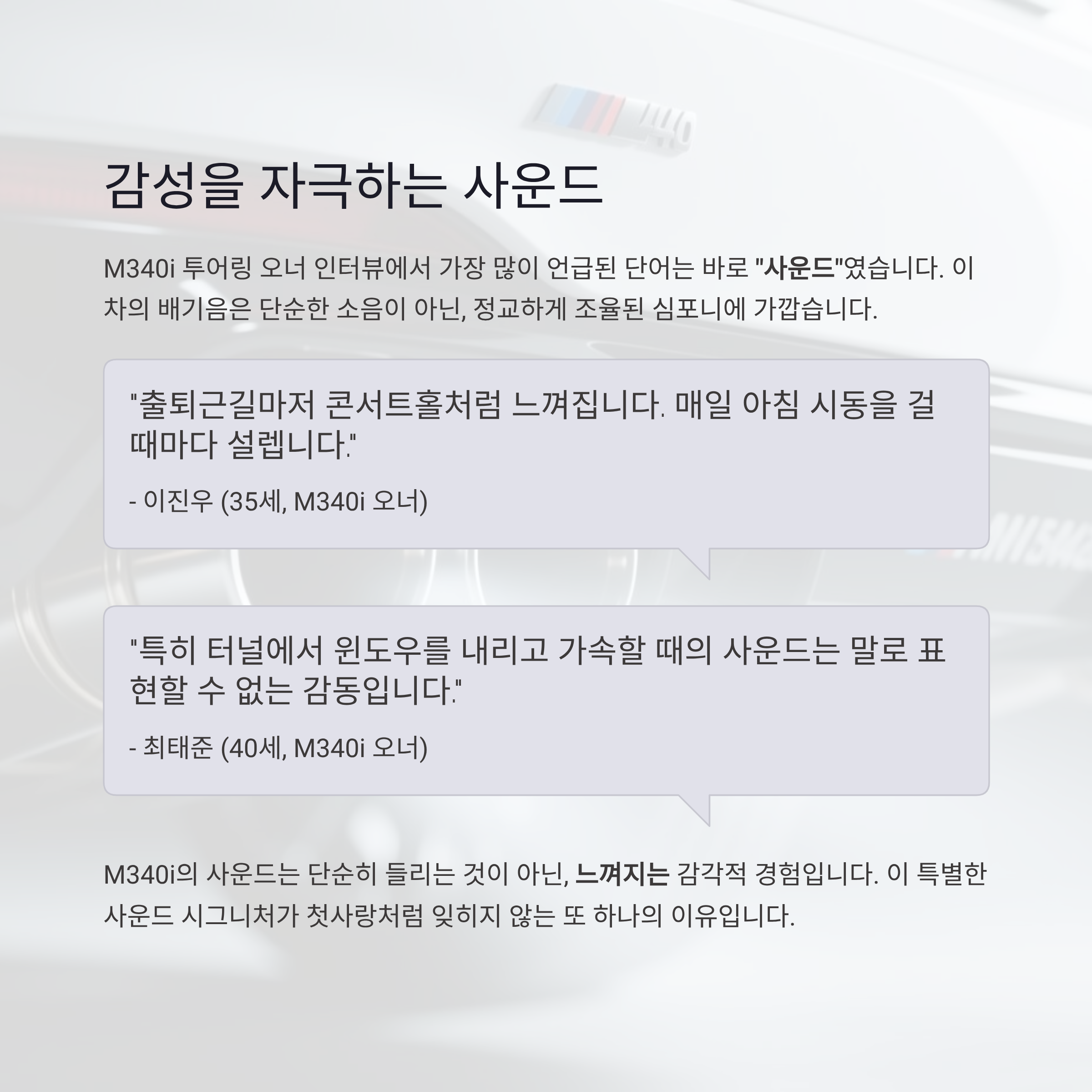 M340i의 배기음은 단순히 소음이 아니라 드라이빙을 더욱 특별하게 만드는 음악에 가깝습니다.