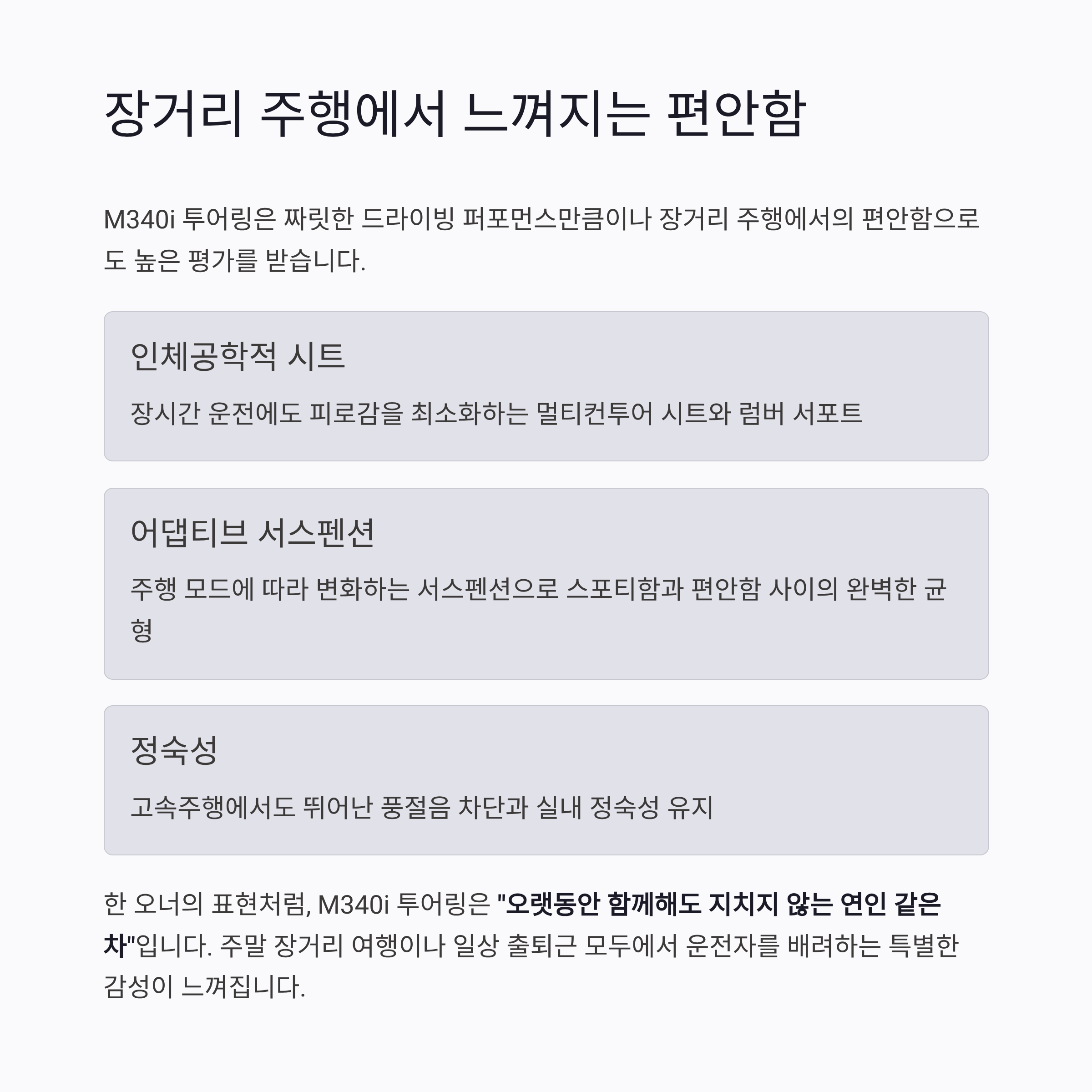 M340i 투어링 역시 첫 만남의 충격적인 감정을 오래도록 간직하게 만듭니다.