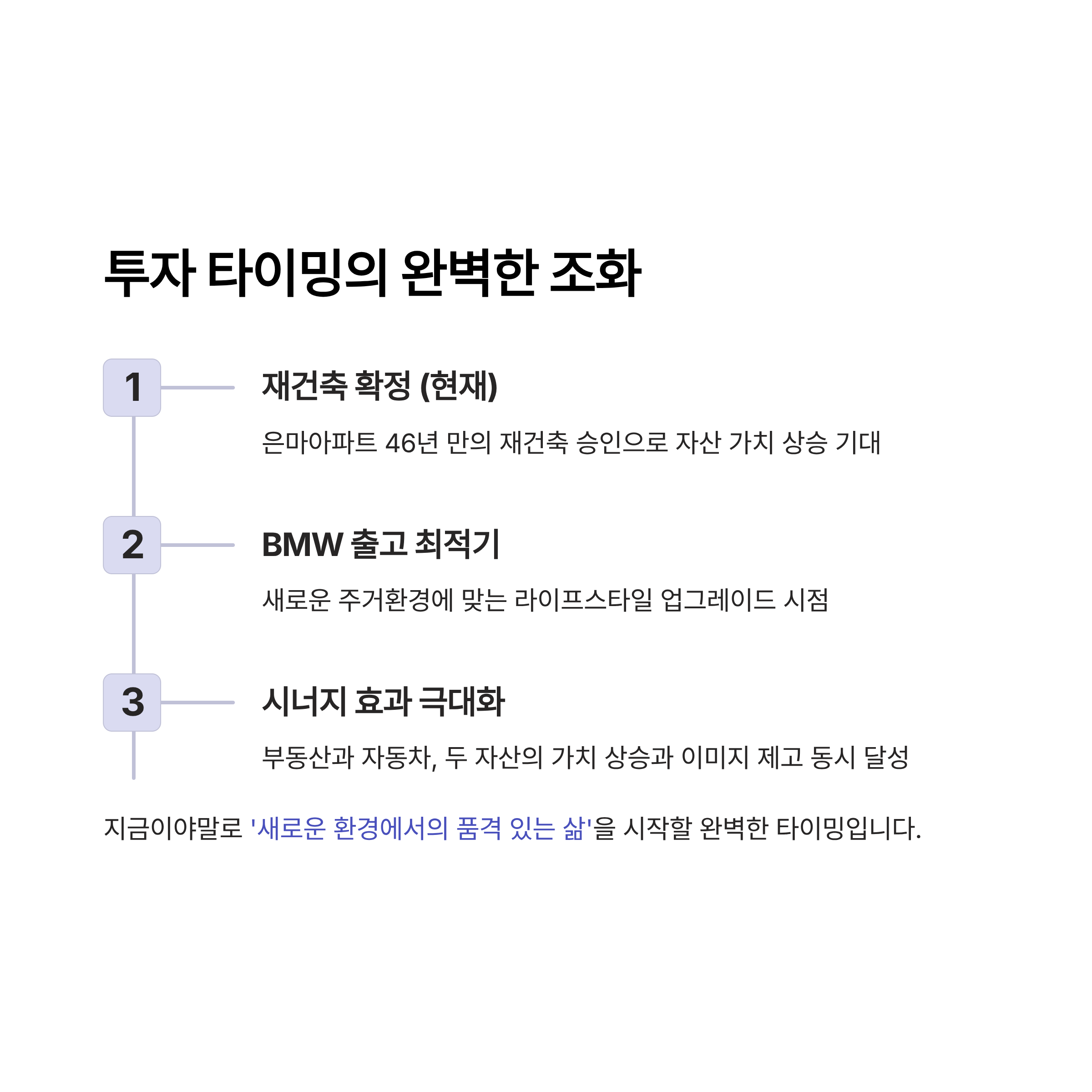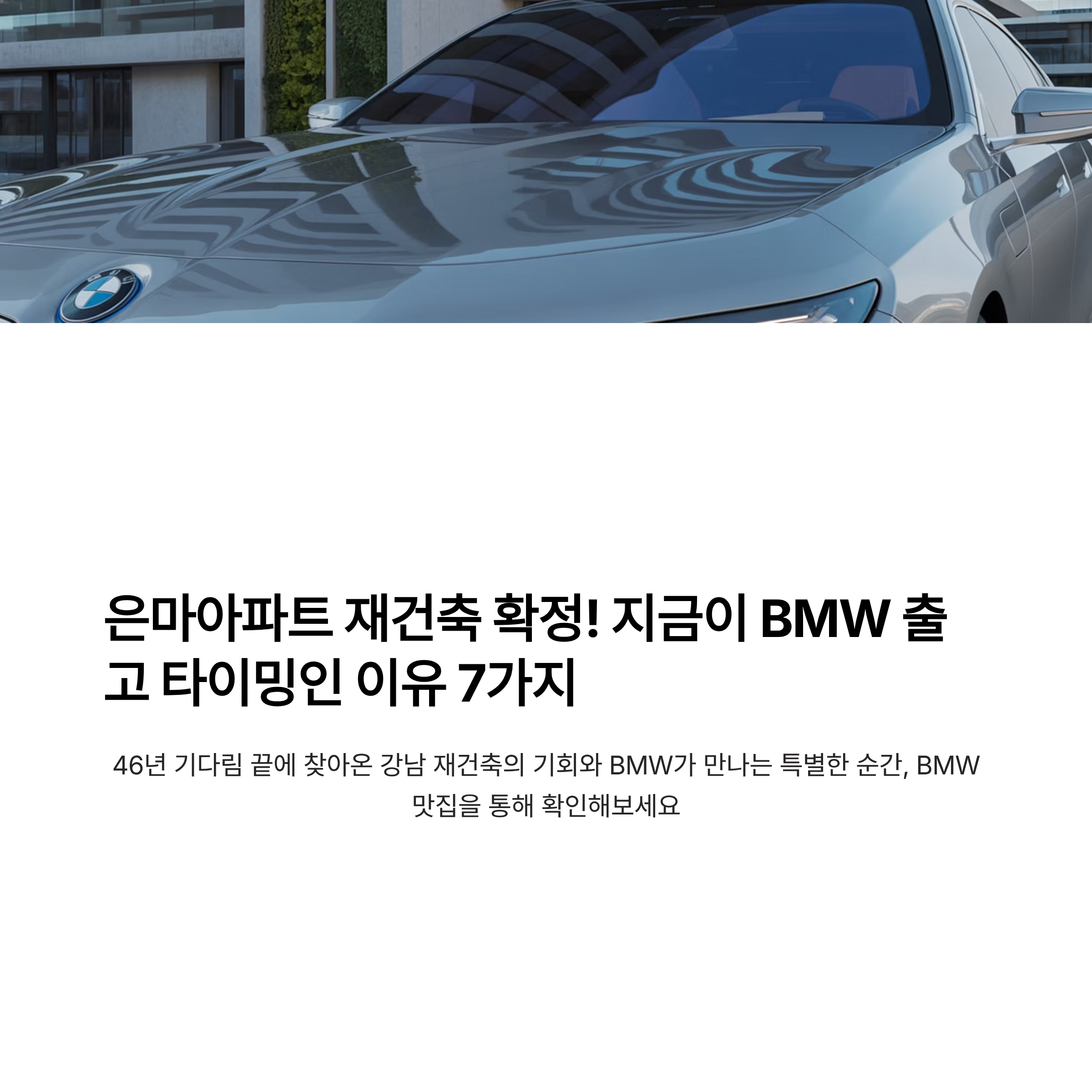 은마아파트 재건축과 BMW 출고는 결국 같은 맥락을 공유합니다. ‘새로운 환경에서의 품격 있는 삶’. 부동산이든 자동차든, 지금이 바로 변화를 맞이할 타이밍입니다.