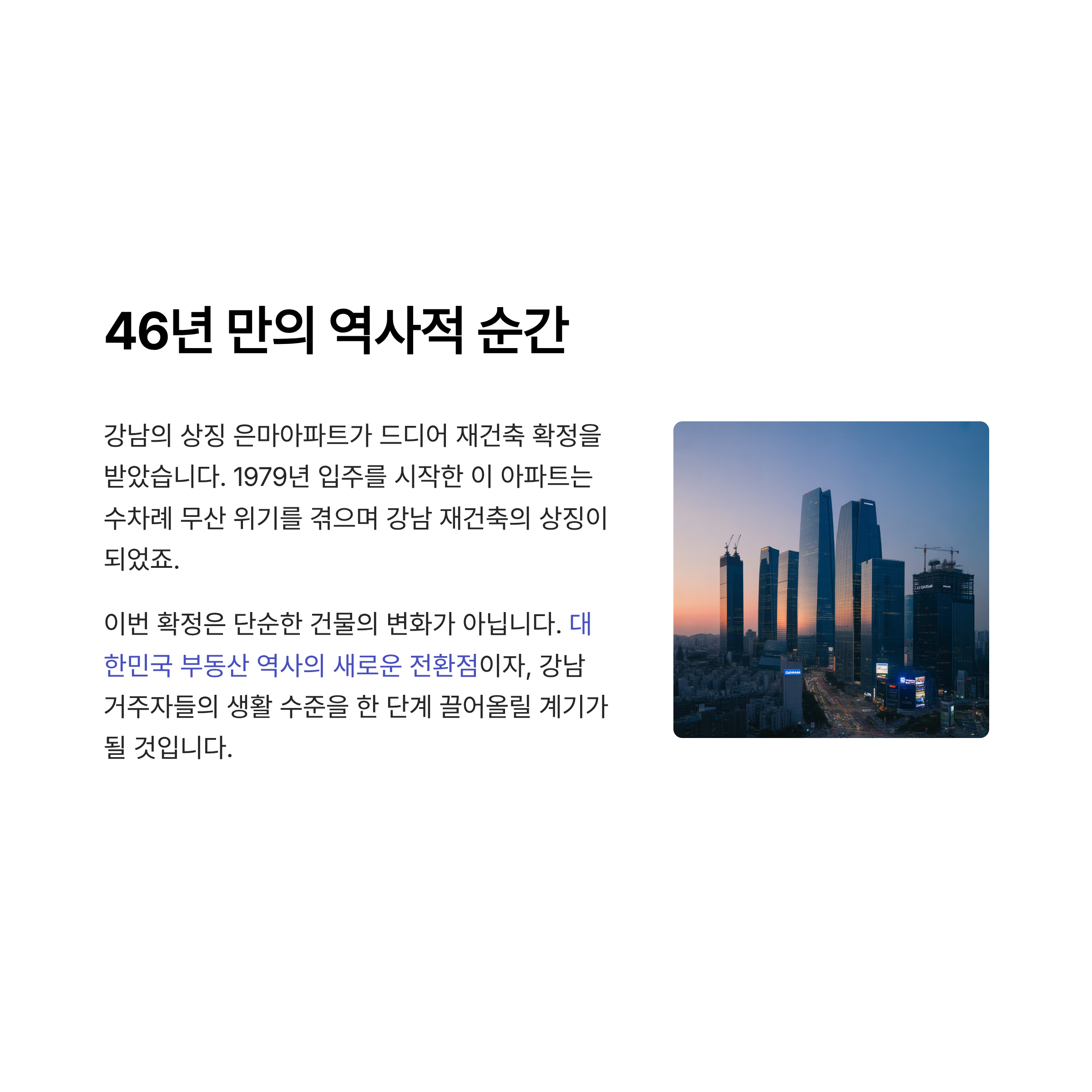 은마아파트는 1979년 입주를 시작한 강남 초기 아파트 단지로, 오랜 기간 재건축 이슈의 중심에 있었습니다. 수차례 무산 끝에 확정된 이번 결정은 강남 재건축의 상징이자 상징적인 부의 이동을 보여주는 사례로 평가됩니다.