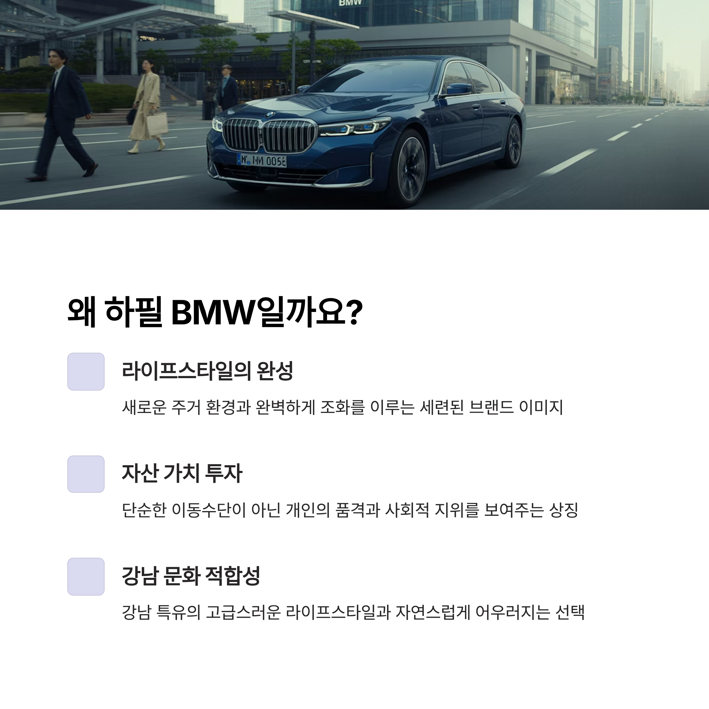 BMW는 단순한 이동 수단이 아니라, 세련된 주거 환경과 어울리는 라이프스타일 아이콘으로 자리 잡았습니다. 특히 강남의 새로운 주거지와 BMW의 브랜드 이미지가 만들어내는 시너지는 자산 가치뿐만 아니라 개인의 만족감을 크게 높여줍니다.