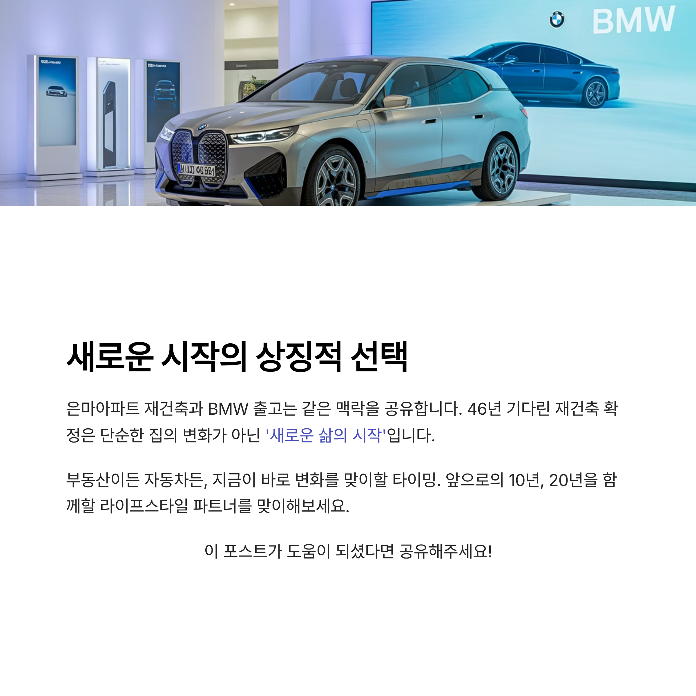 은마아파트 재건축과 BMW 출고는 결국 같은 맥락을 공유합니다. ‘새로운 환경에서의 품격 있는 삶’. 부동산이든 자동차든, 지금이 바로 변화를 맞이할 타이밍입니다.