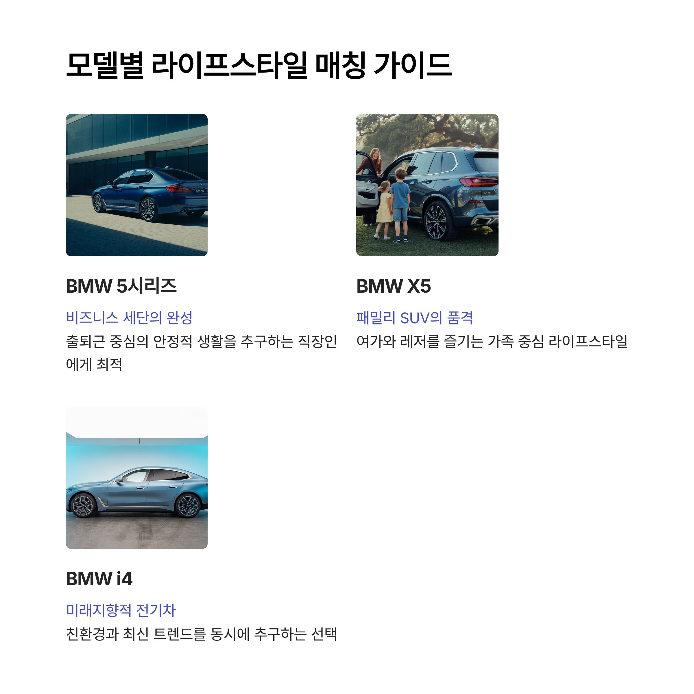 | BMW 5시리즈 | 비즈니스와 일상 모두 아우르는 세단 | 출퇴근 중심의 안정적 생활 |
