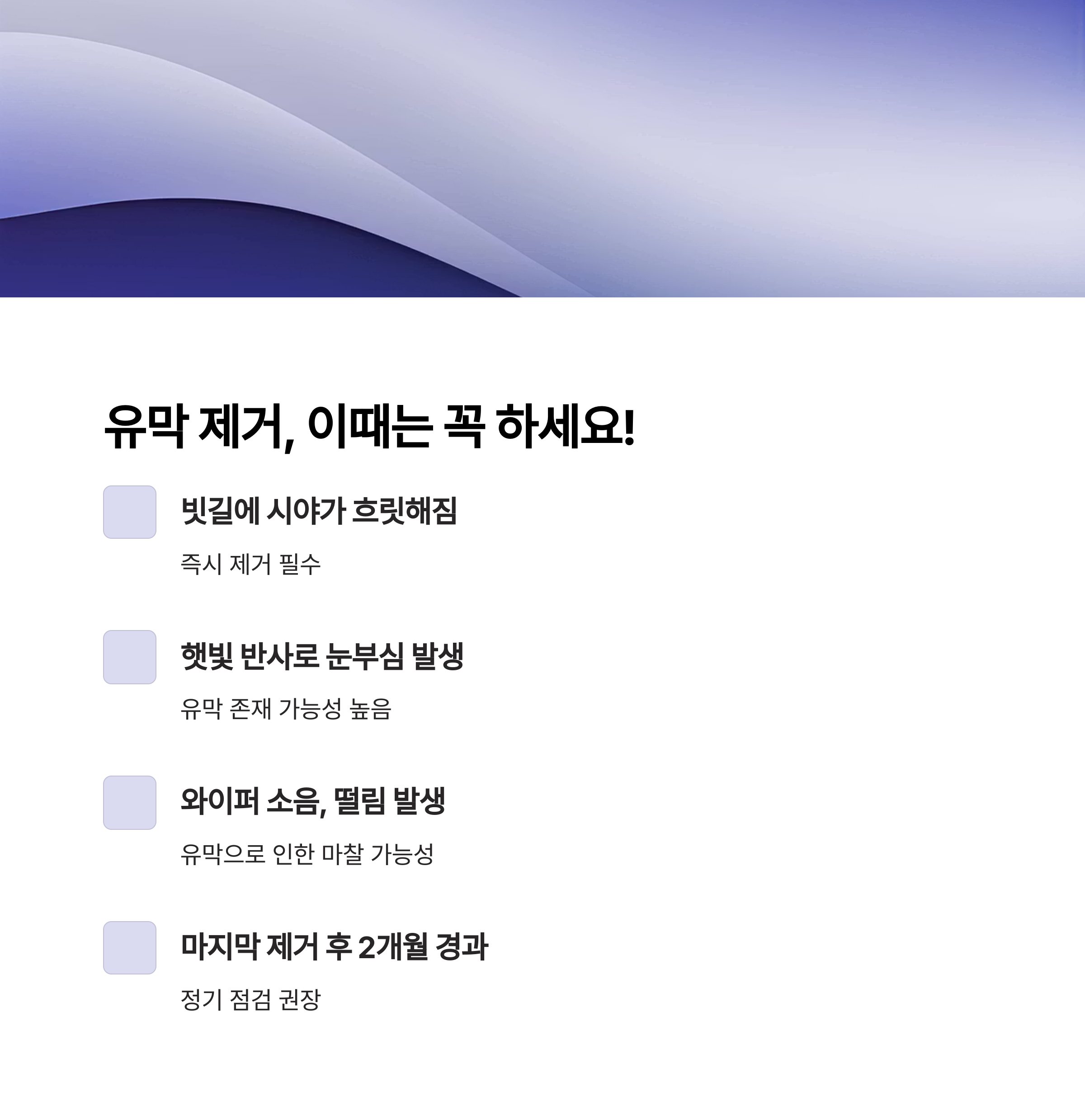 | 와이퍼 소음, 떨림 발생 | 유막으로 인한 마찰 가능성 |