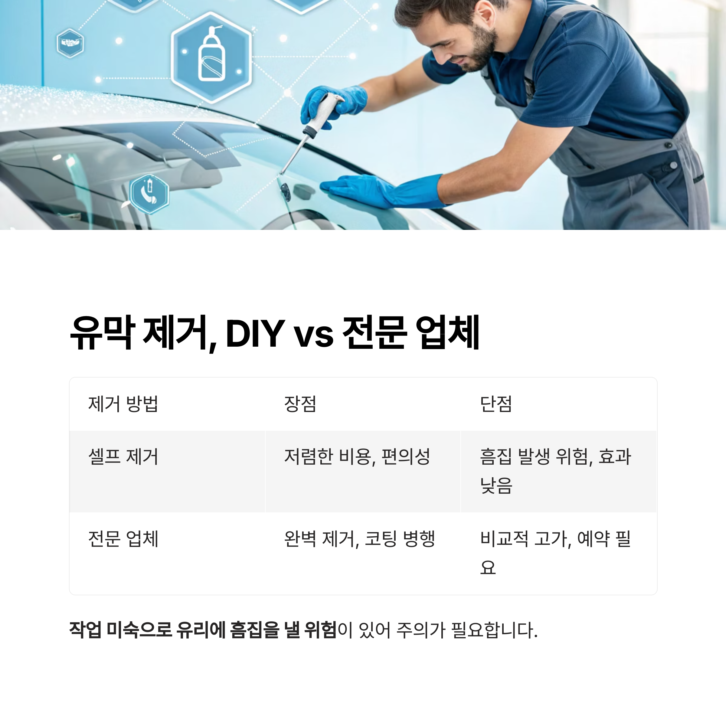 | 전문 업체 | 완벽 제거, 코팅 병행 | 비교적 고가, 예약 필요 |