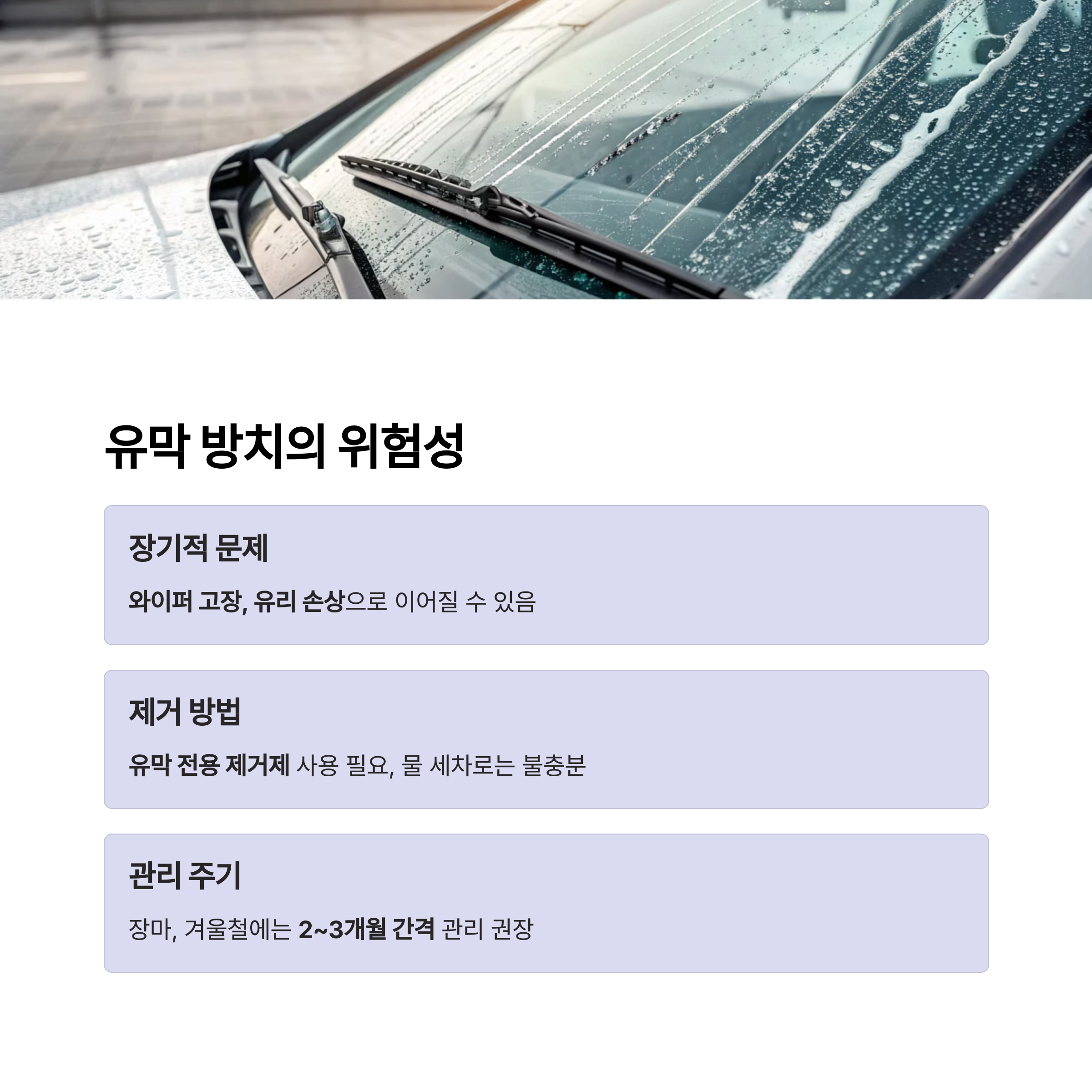 유막이 오래 쌓이면 단순한 시야 방해를 넘어 와이퍼 고장, 유리 손상으로 이어질 수 있습니다.