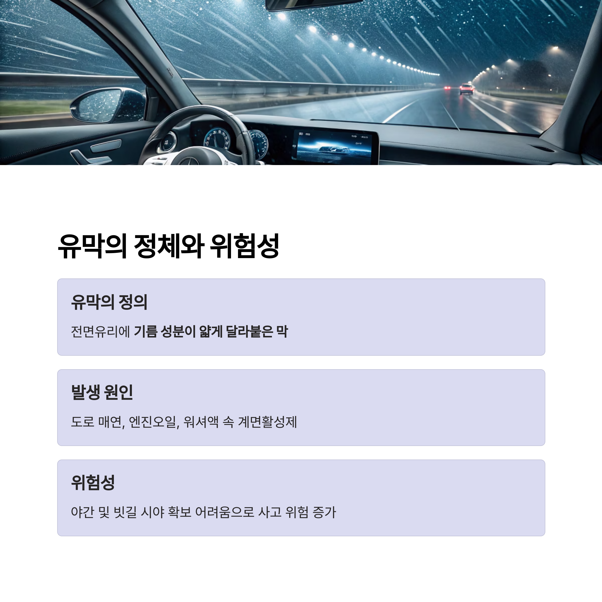 자동차 전면유리의 유막은 시야를 방해하고, 특히 비 오는 날 교통사고 위험을 높이는 원인이 됩니다.