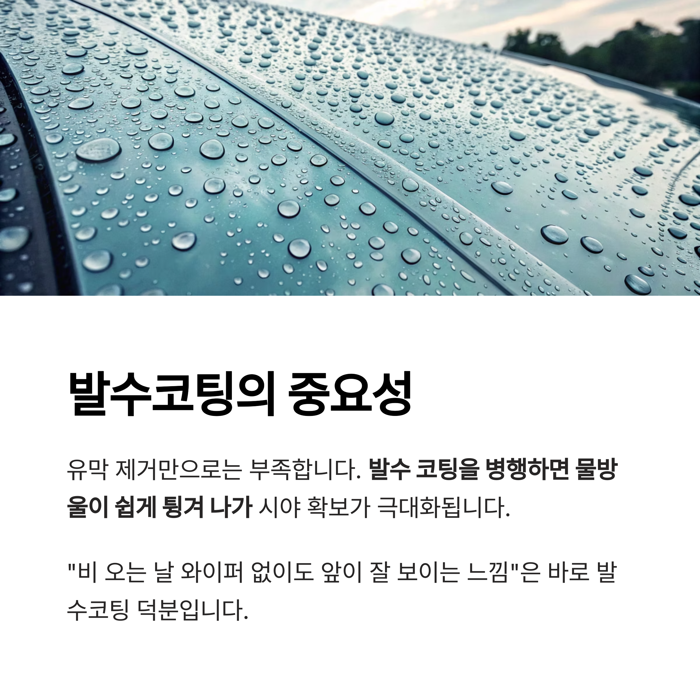 발수 코팅까지 병행해야 물방울이 쉽게 튕겨 나가고 시야 확보가 극대화됩니다.