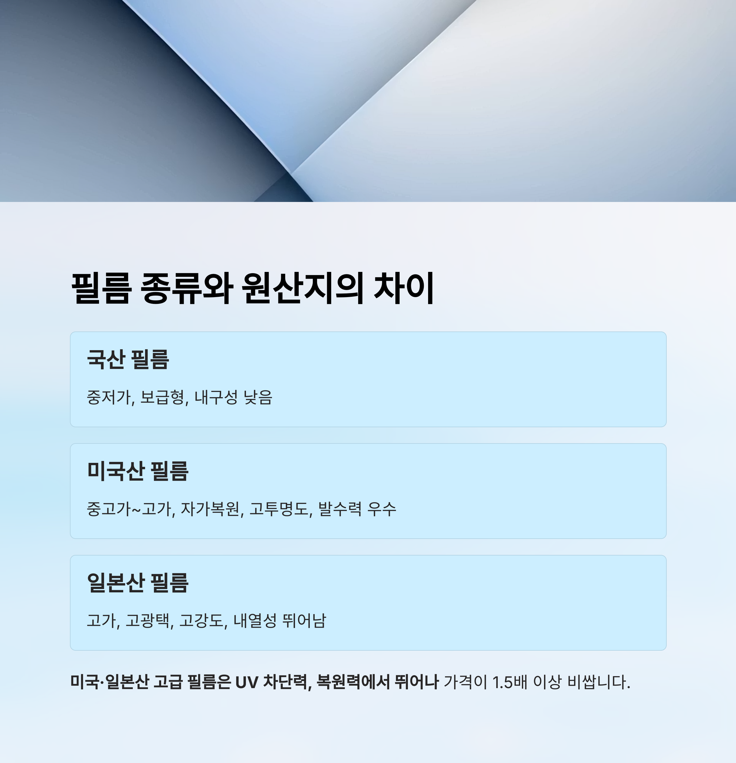 반면, 미국·일본산 고급 필름은 UV 차단력, 복원력에서 뛰어나