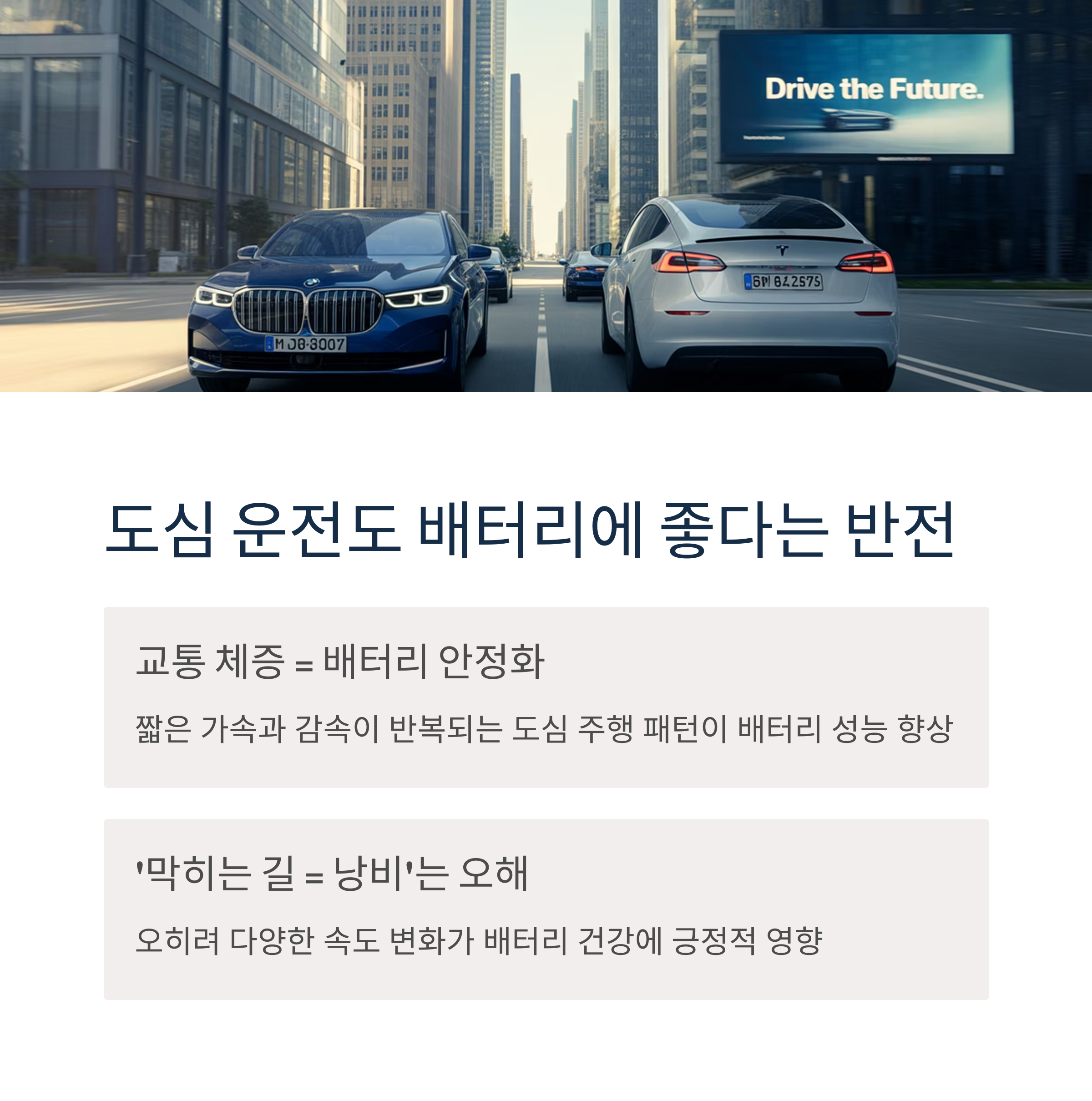 이는 곧, ‘막히는 길=배터리 낭비’라는 오해를 깨는 결과입니다.