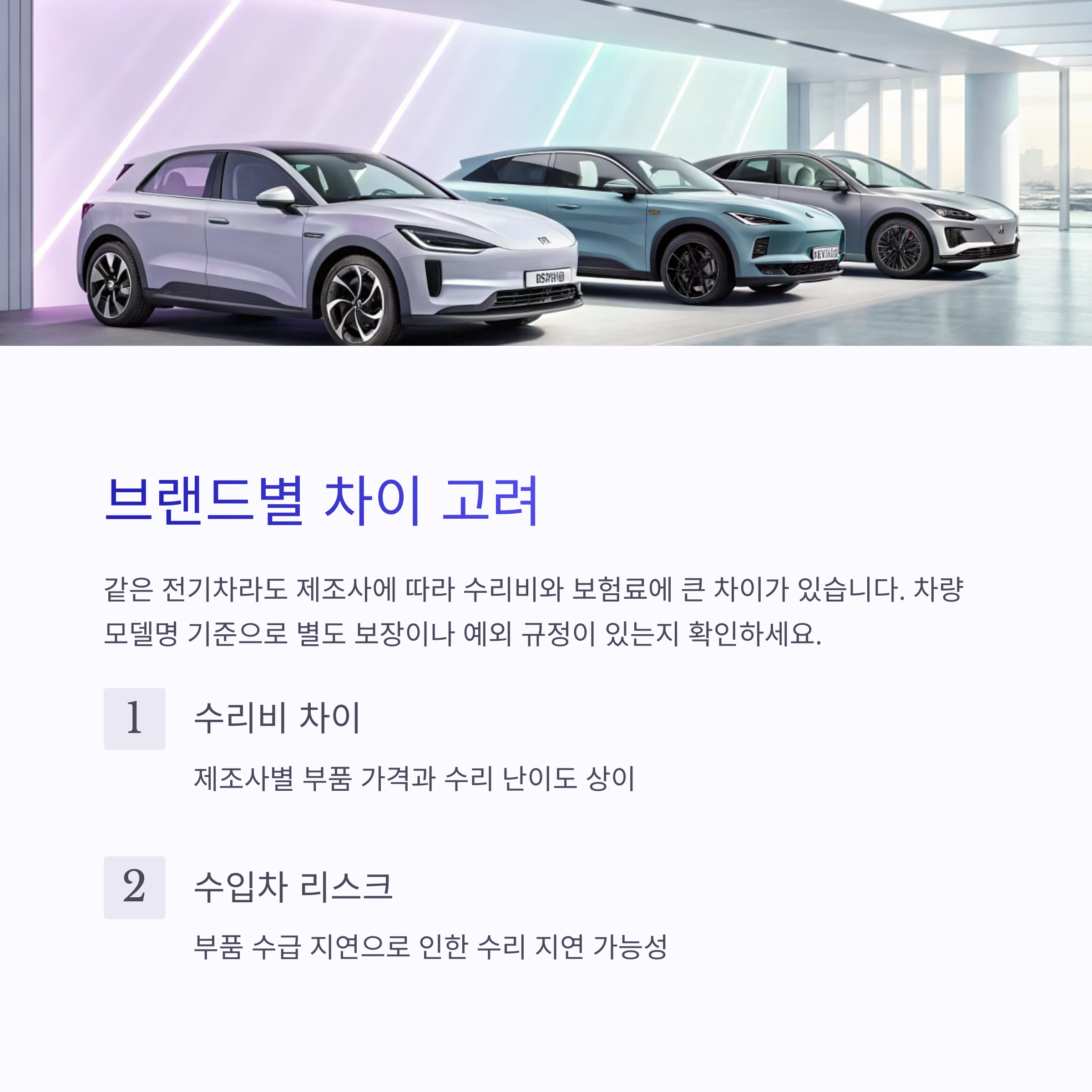 특히 수입 전기차의 경우 부품 수급 지연으로 인한 수리 지연 리스크도 고려해야 합니다.