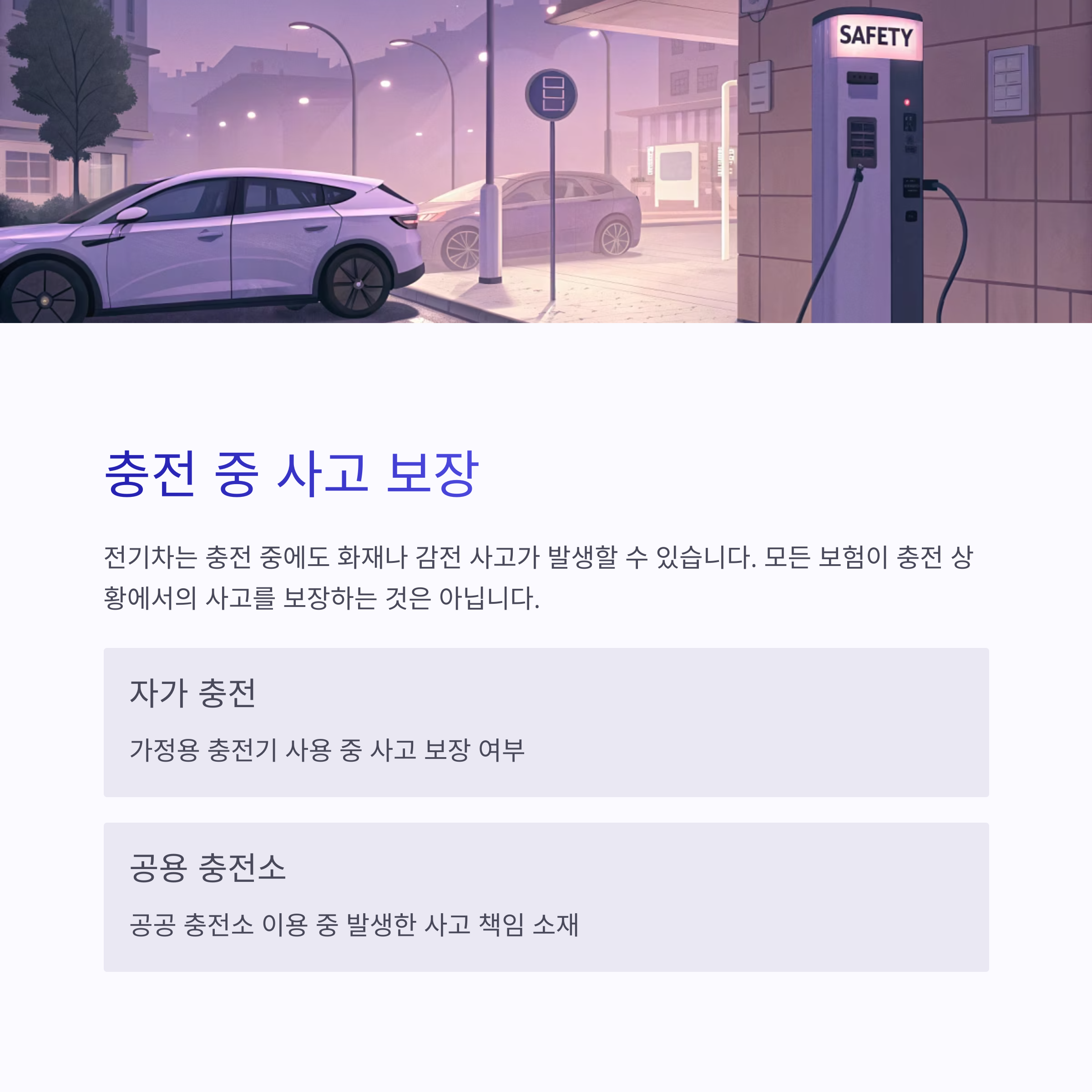 "자가 충전 또는 공용 충전소 사용 중 발생한 사고 보장 여부"를 반드시 확인해야 하며,
