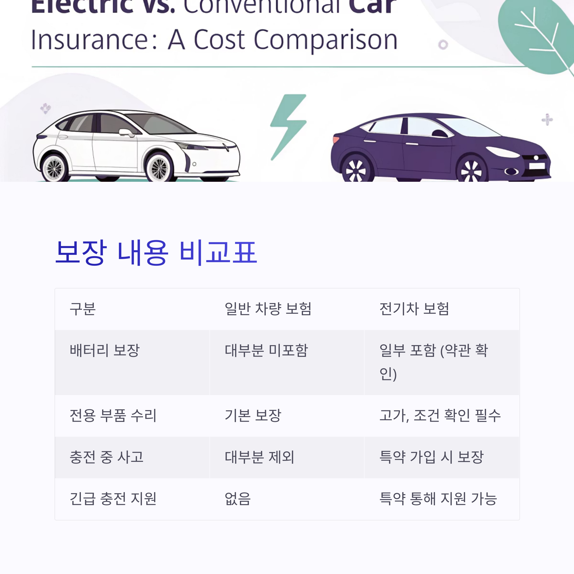 특히 배터리 관련 보장, 전용 부품 수리비, 특약 적용 여부 등은 일반 차량과는 비교할 수 없는 중요한 요소입니다.