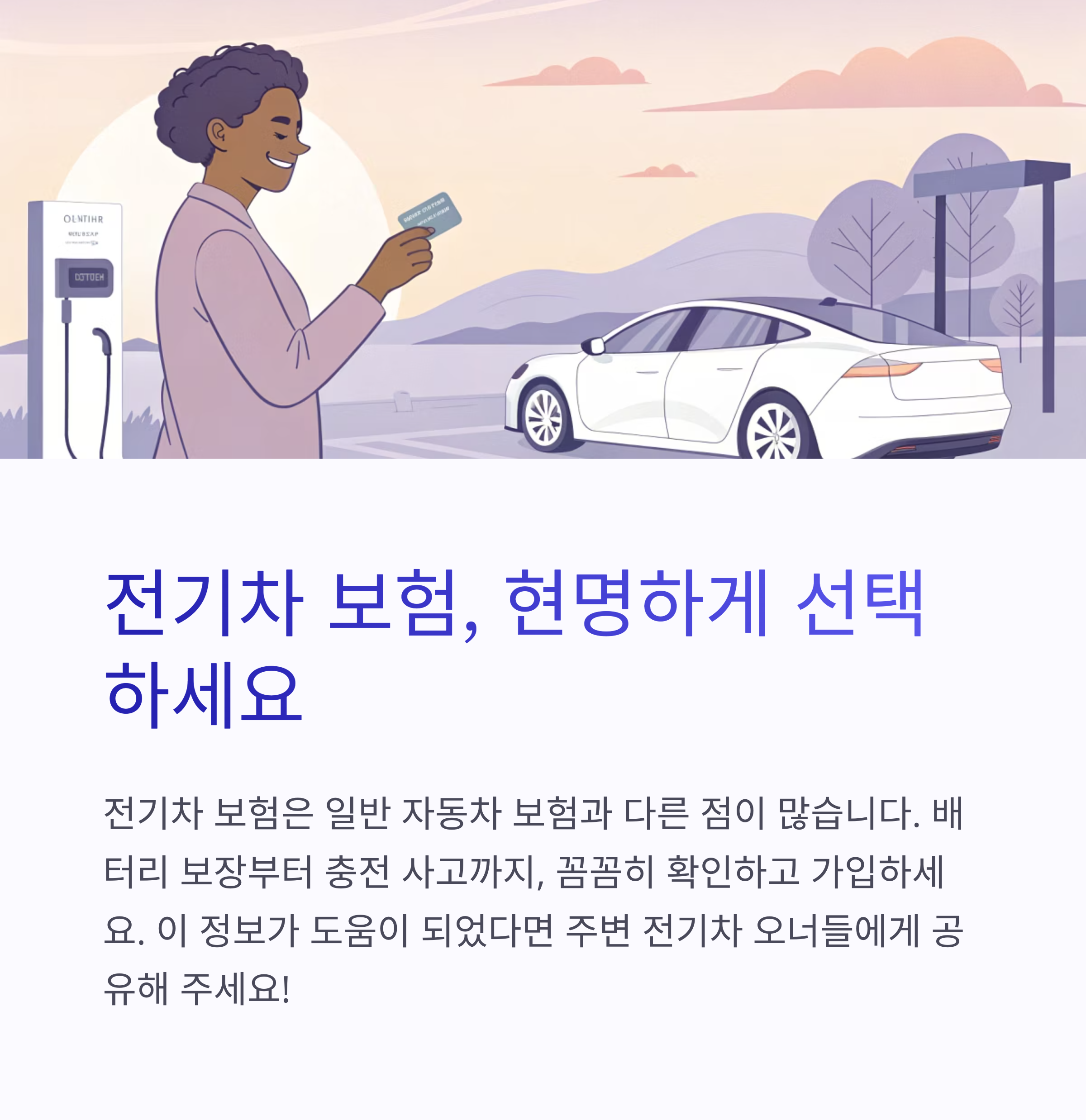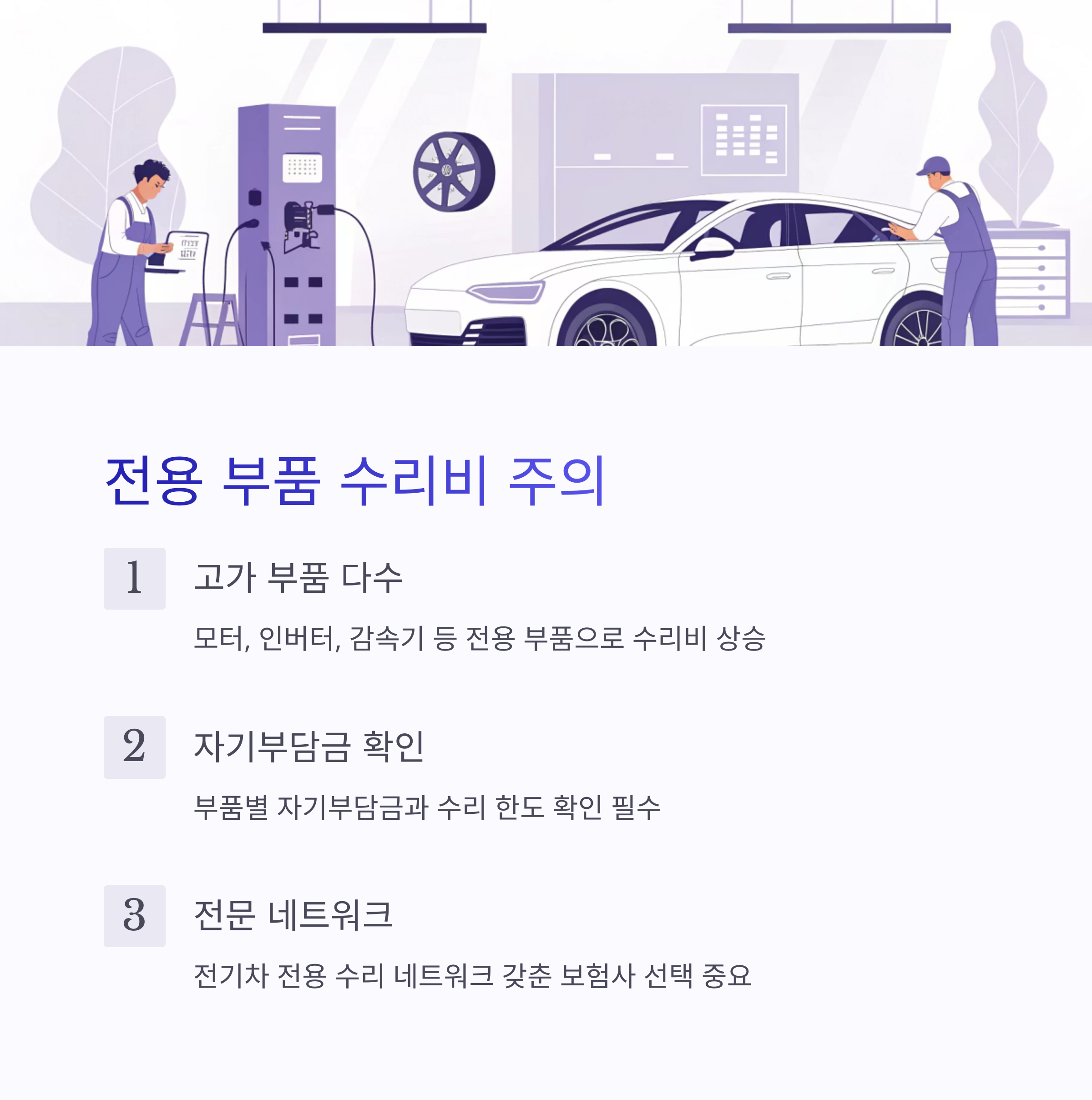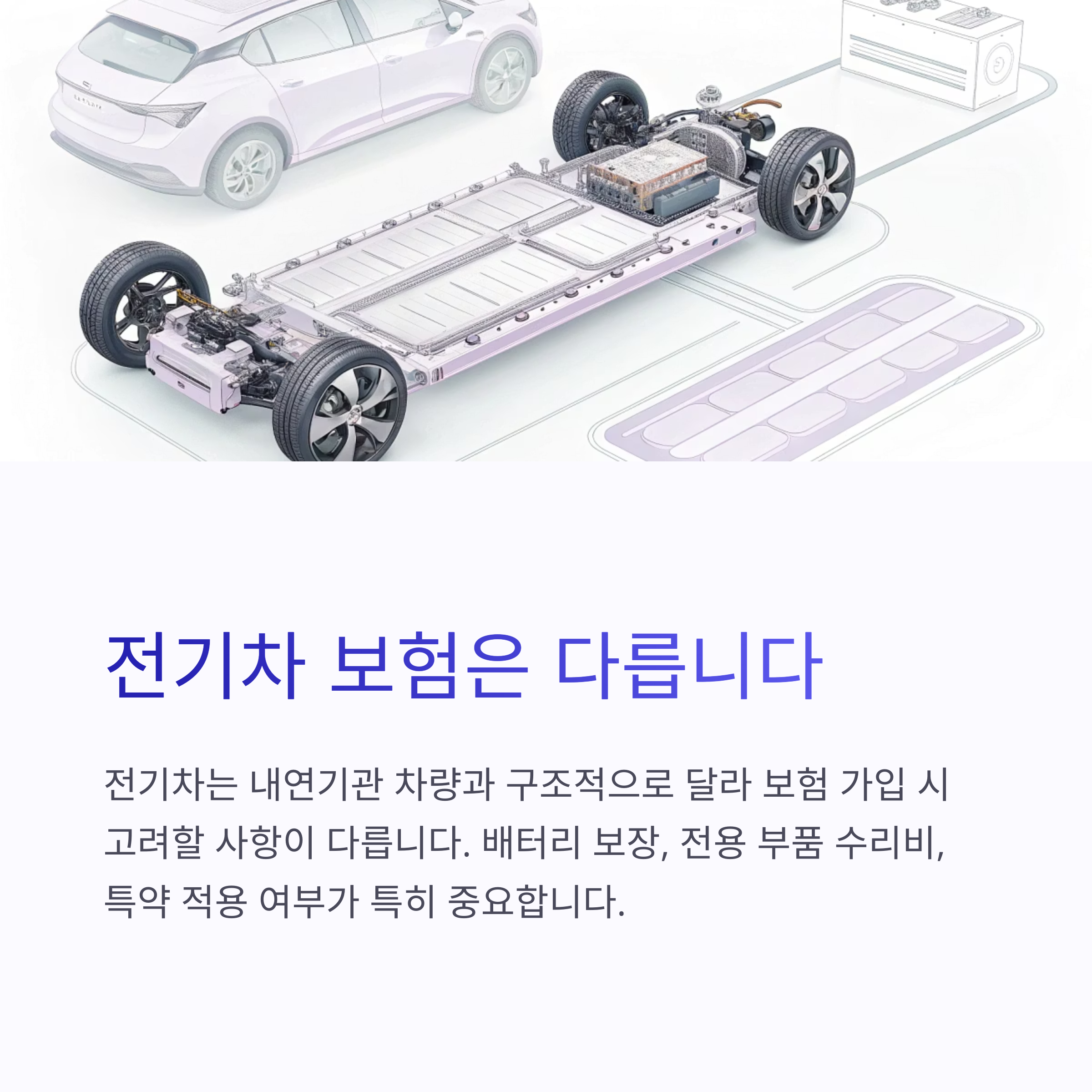 특히 배터리 관련 보장, 전용 부품 수리비, 특약 적용 여부 등은 일반 차량과는 비교할 수 없는 중요한 요소입니다.