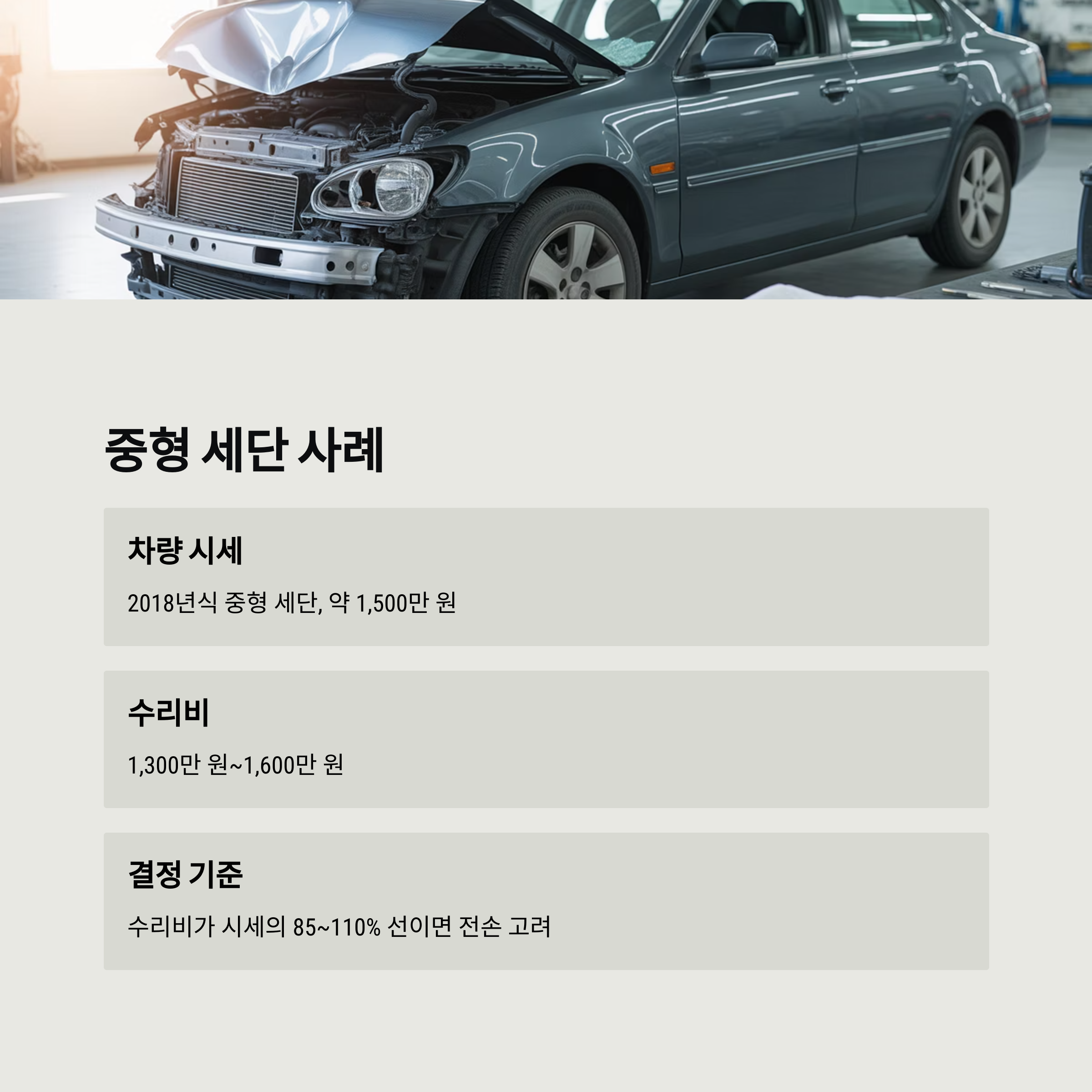 수리비가 시세의 80%를 넘기 시작하면 보험사는 전손 가능성을 열어두기 시작합니다
