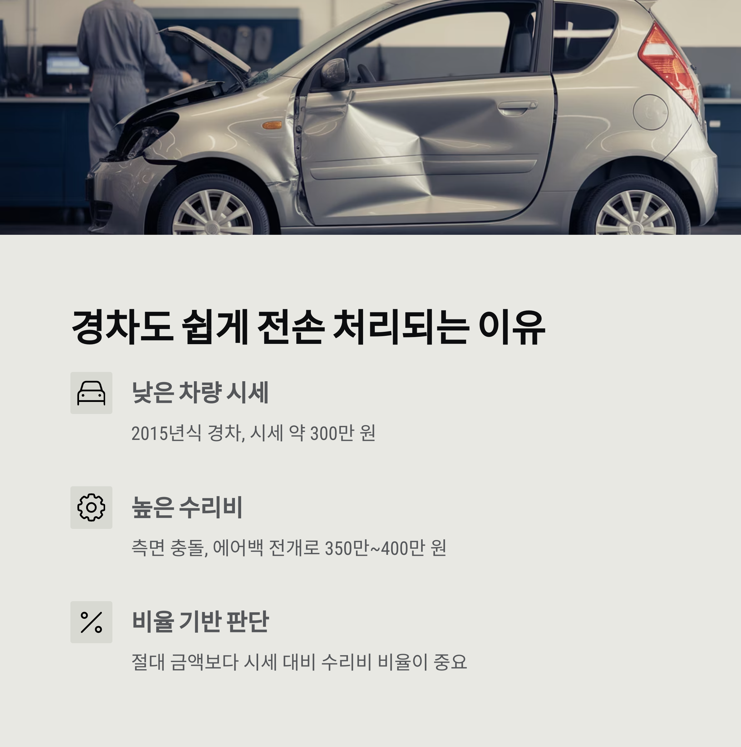 시세가 낮은 경차는 수리비가 조금만 올라가도 전손 처리로 이어집니다