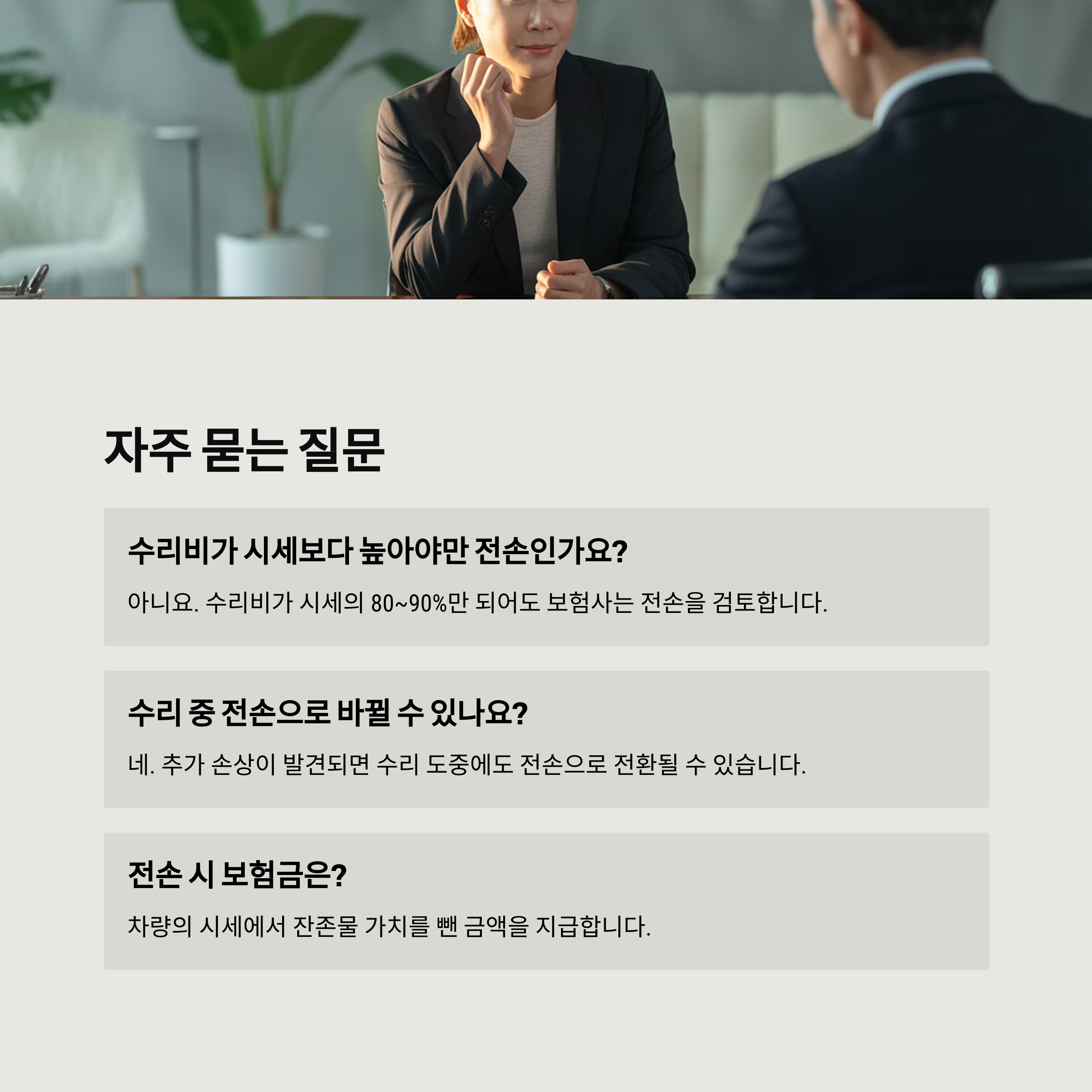 → 아니요. 수리비가 시세의 80~90%만 되어도 보험사는 전손을 검토합니다