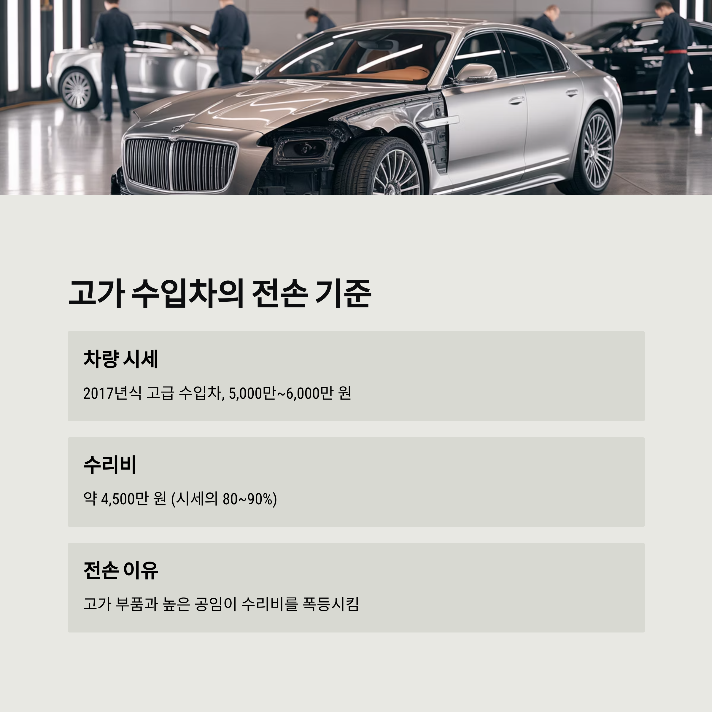 수입차의 경우, 수리비가 시세의 80~90%에 도달하면 전손 처리를 심각하게 고려합니다