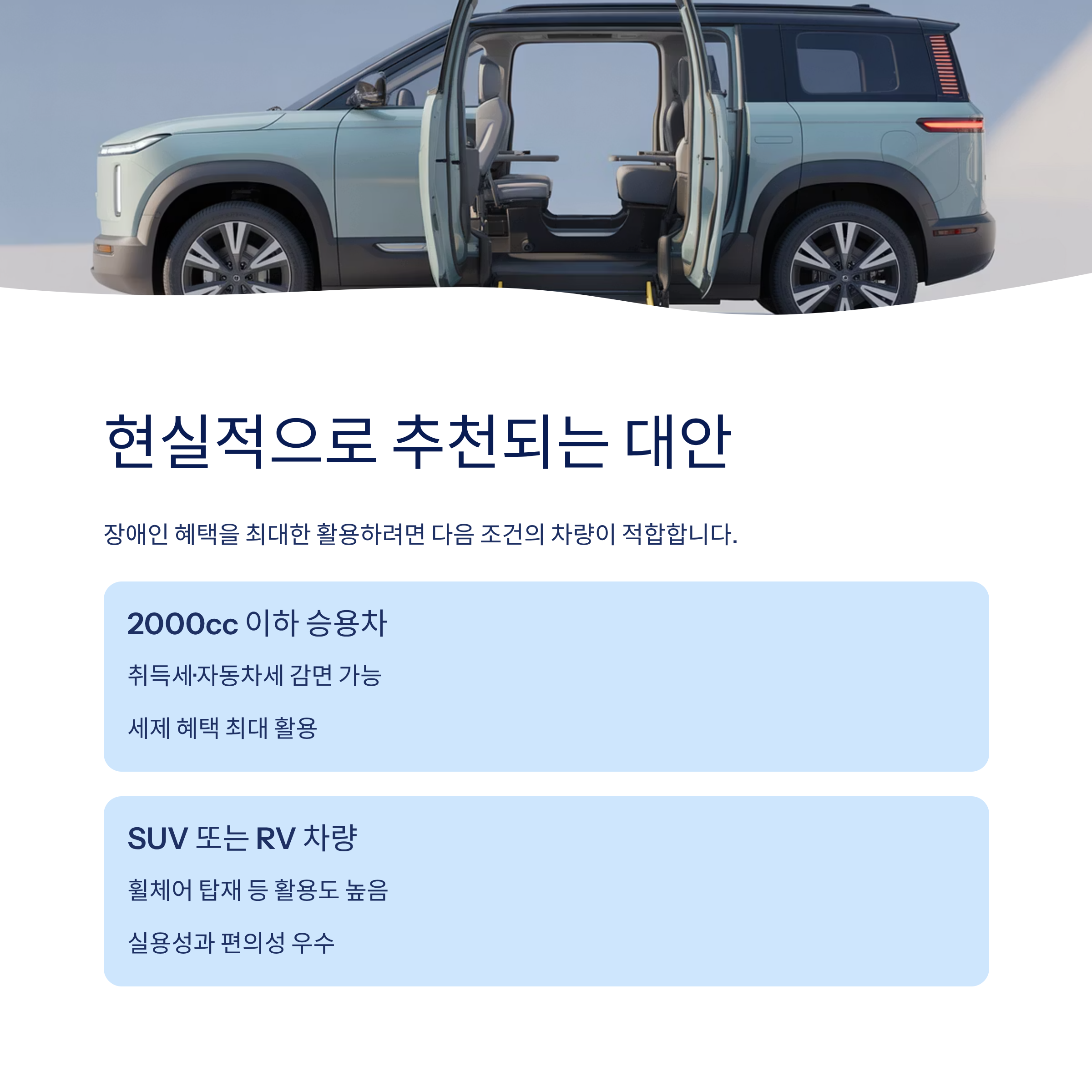 | SUV 또는 RV 차량 | 휠체어 탑재 등 활용도 높음 |