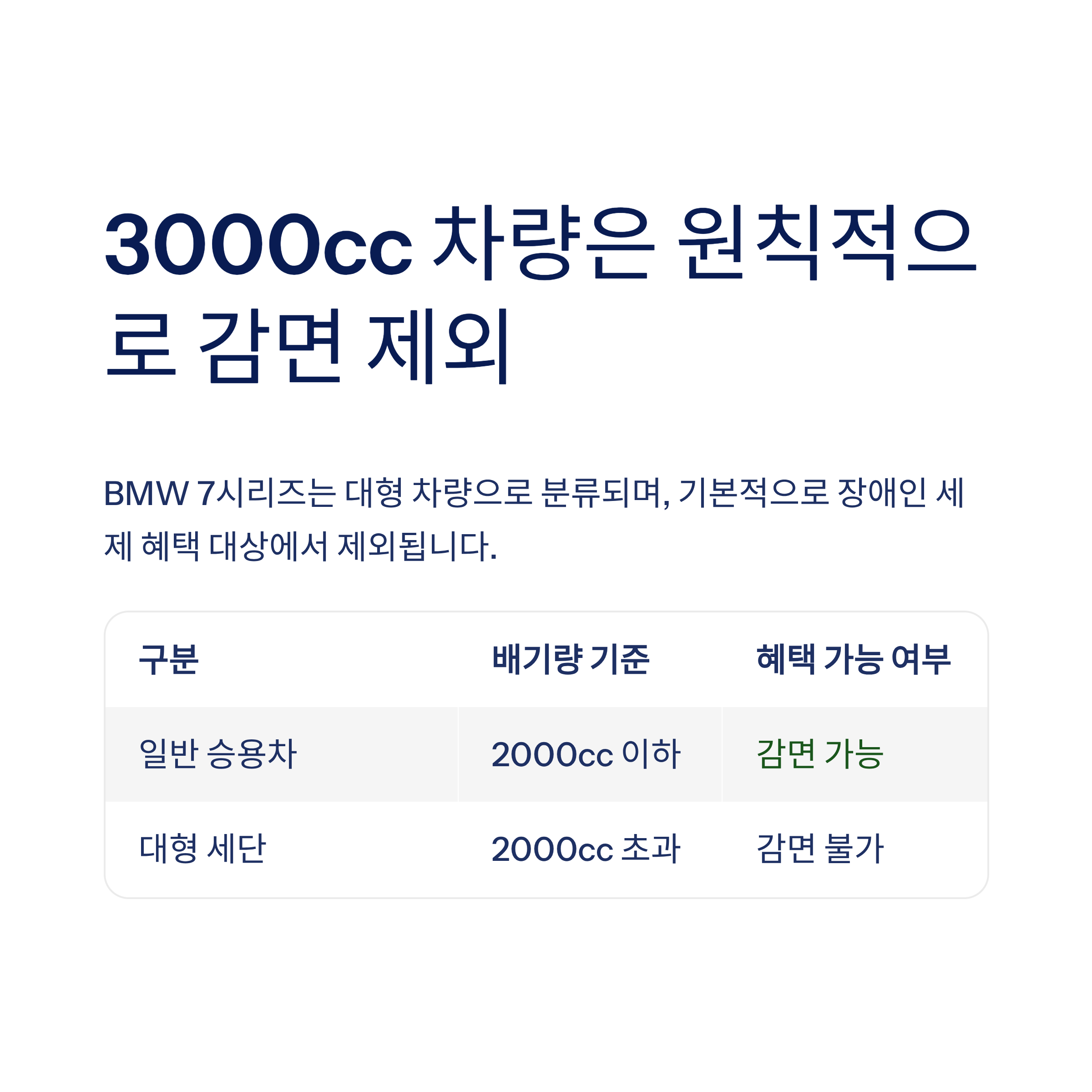 3000cc BMW 7시리즈는 대형 차량으로 분류되며, 기본적으로 장애인 세제 혜택 대상에서 제외됩니다.