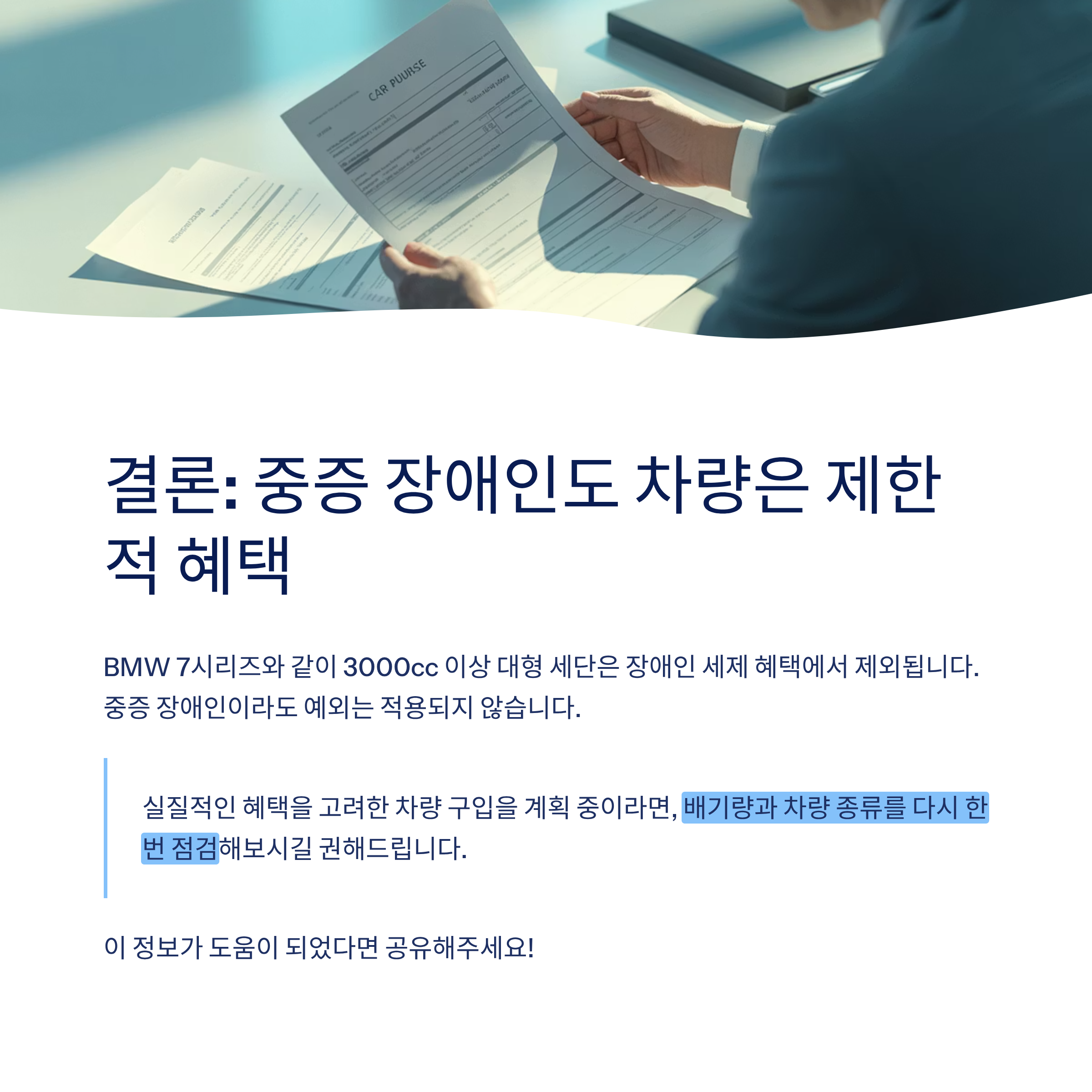 중증 장애인이라 하더라도 예외는 적용되지 않으며, 혜택을 받으려면 차량 선택에 신중함이 필요합니다.