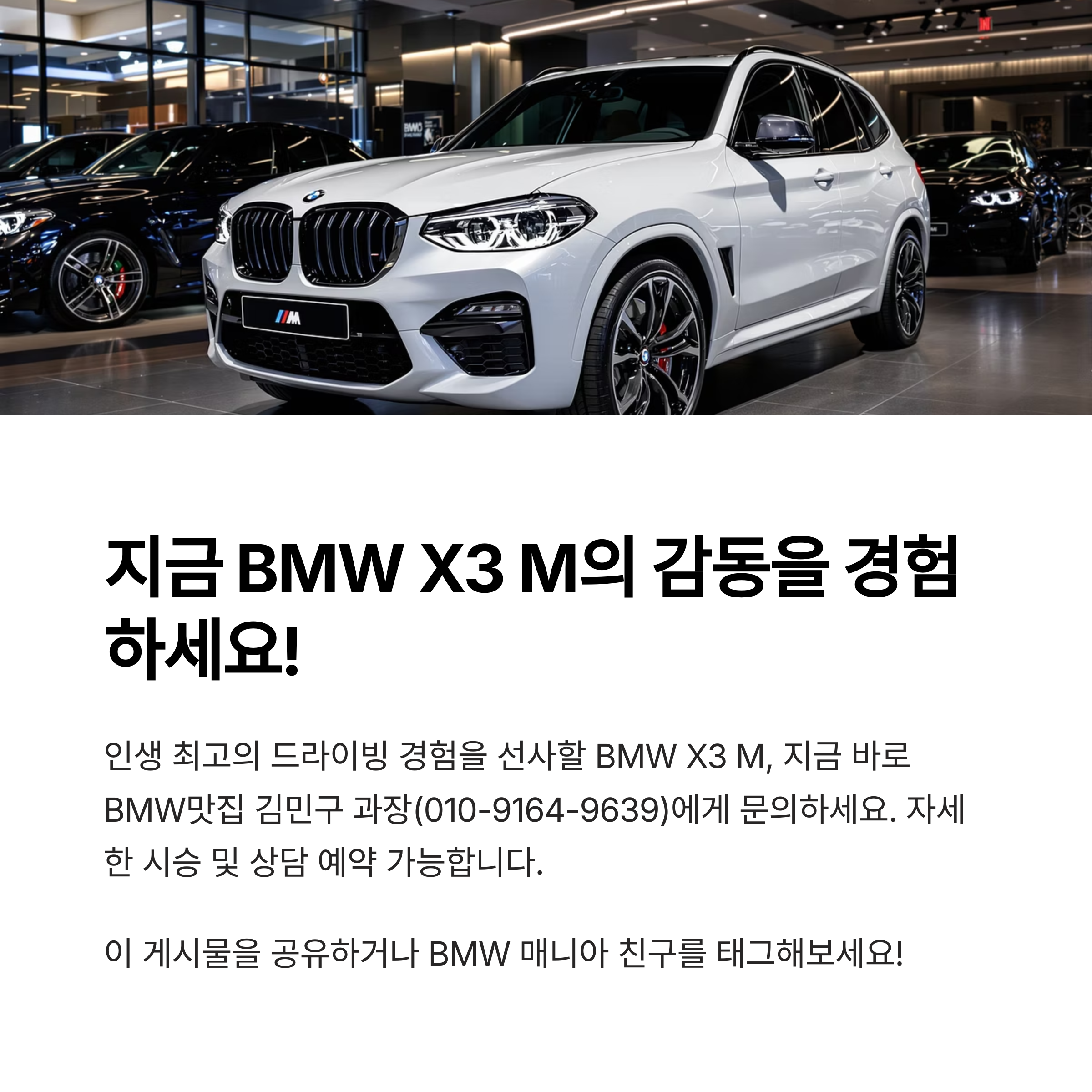 망설이지 마세요! X3 M의 뜨거운 심장을 지금 당신의 것으로 만들어보세요. 김민구 과장에게 전화하기