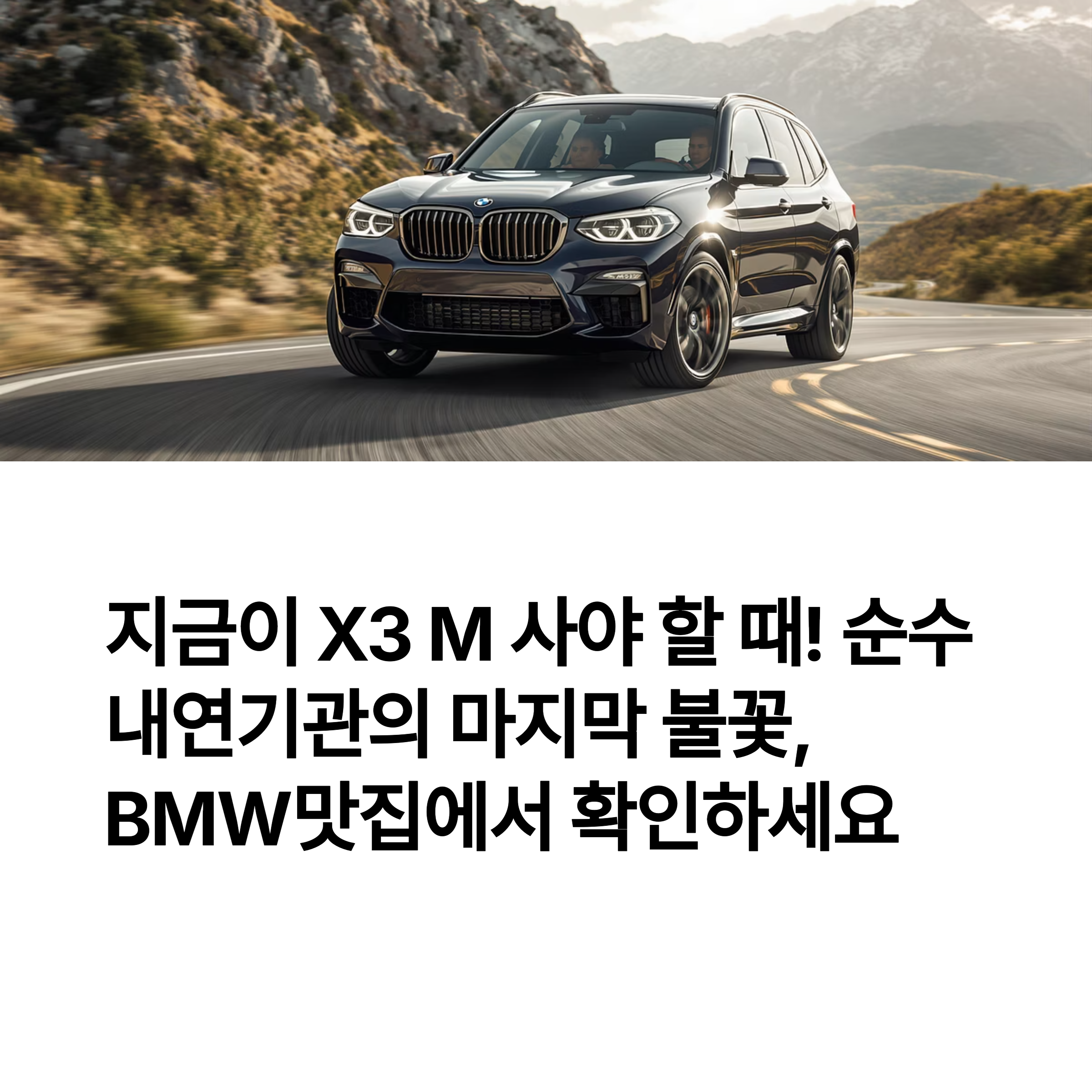 BMW X3 M, 이 차는 단순한 SUV가 아닙니다. 순수 내연기관의 심장이 뛰는 마지막 전설, 그 뜨거운 맥박을 지금 느껴보세요. 전동화 시대가 다가오고 있지만, X3 M의 3.0L 직렬 6기통 터보 엔진은 여전히 당신의 가슴을 뛰게 할 단 하나의 선택입니다. BMW맛집이 왜 지금이 X3 M을 구매할 절호의 기회인지, 그리고 그 매력을 생생하게 전해드립니다!