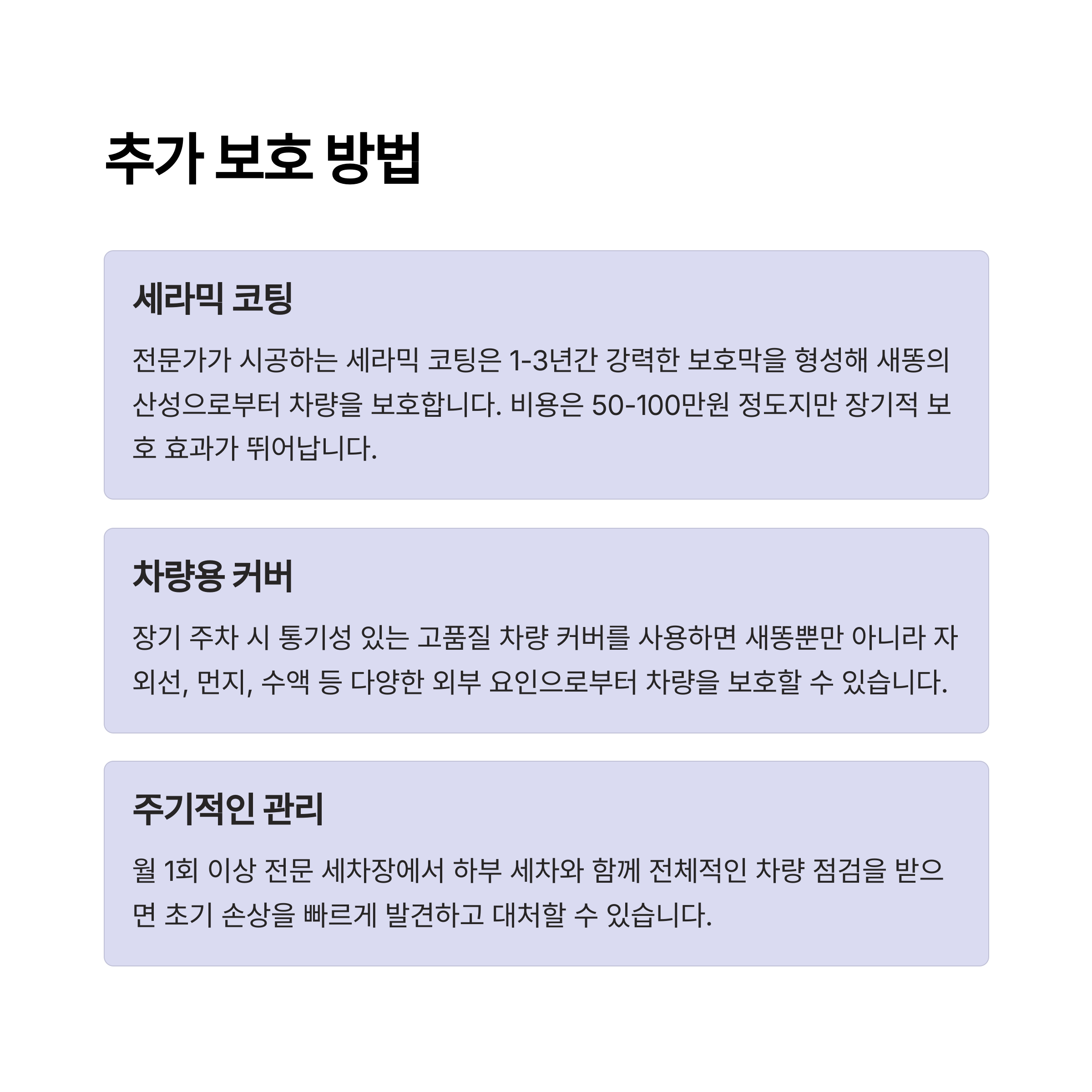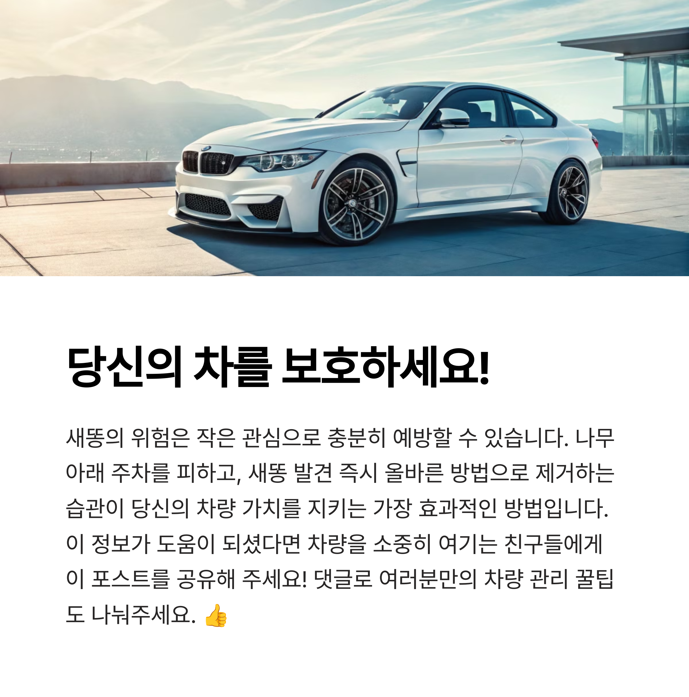 중요한 점은 새똥 피해는 '예방'과 '즉시 제거'만으로 충분히 막을 수 있다는 사실입니다. 야외 주차 환경을 점검하고, 정기적인 차량 관리 습관을 들이면 소중한 내 차를 오랫동안 깔끔하게 유지할 수 있습니다.
