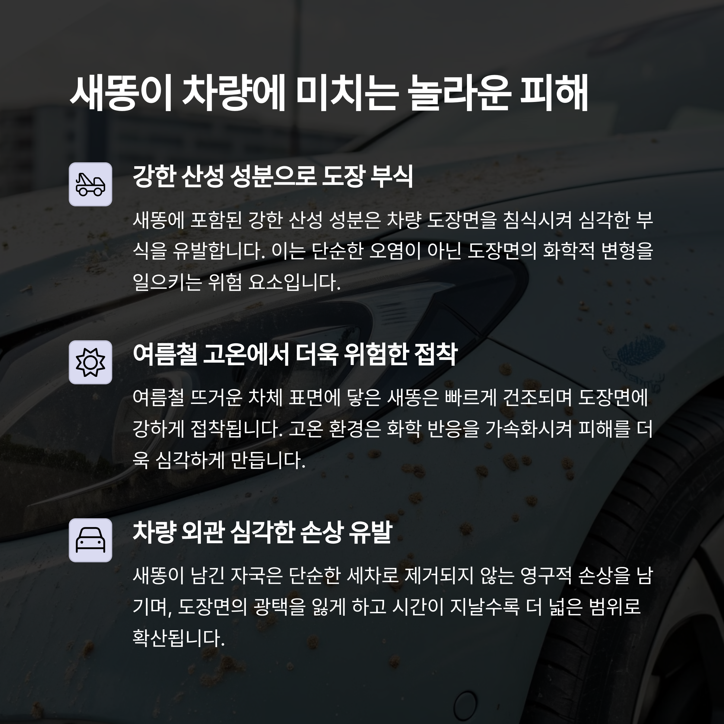 | 시각적 손상 | 차량 외관에 얼룩이 남아 보기 싫은 인상을 줌 |