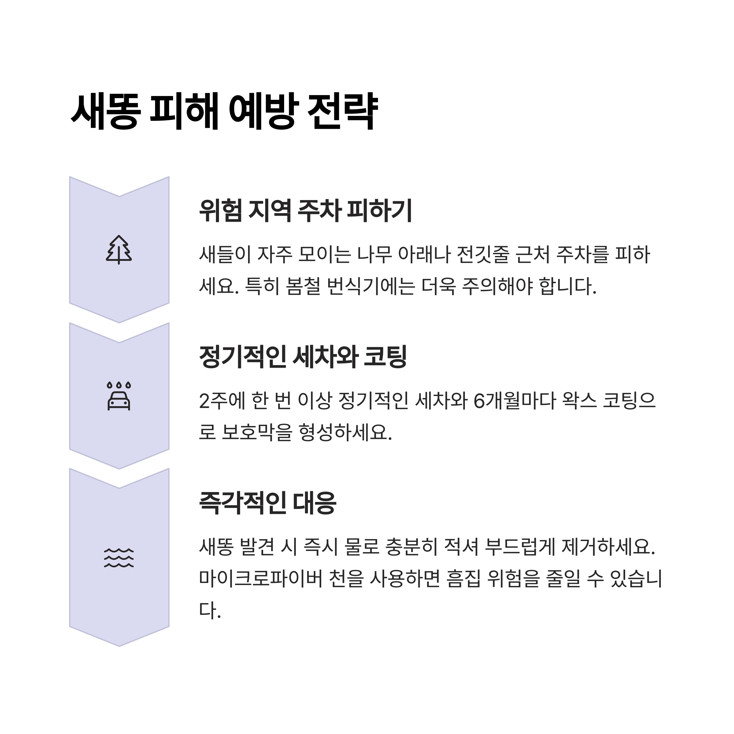 주차 습관만 바꾸어도 새똥으로 인한 피해를 획기적으로 줄일 수 있으며, 차량 보호에 큰 도움이 됩니다.