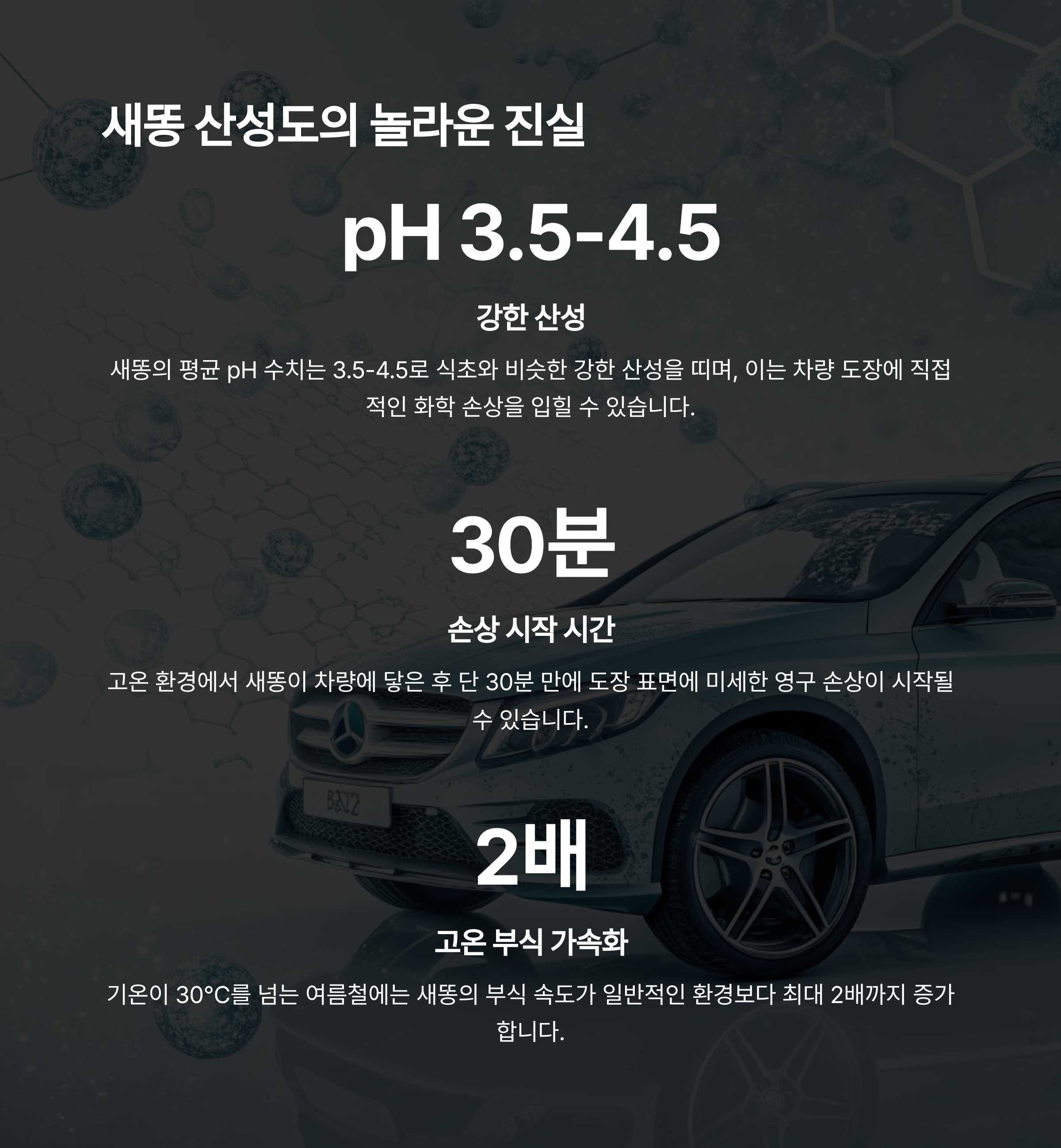 새똥이 차량에 닿는 순간부터 이미 차량 외장 손상은 시작됩니다. 새똥은 일반적으로 pH 3~4의 강한 산성을 띠며, 그 안에는 요산(Uric acid)이라는 화합물이 포함되어 있습니다. 이 요산은 물에 잘 녹지 않기 때문에 일반적인 비나 습기에도 쉽게 씻기지 않습니다.