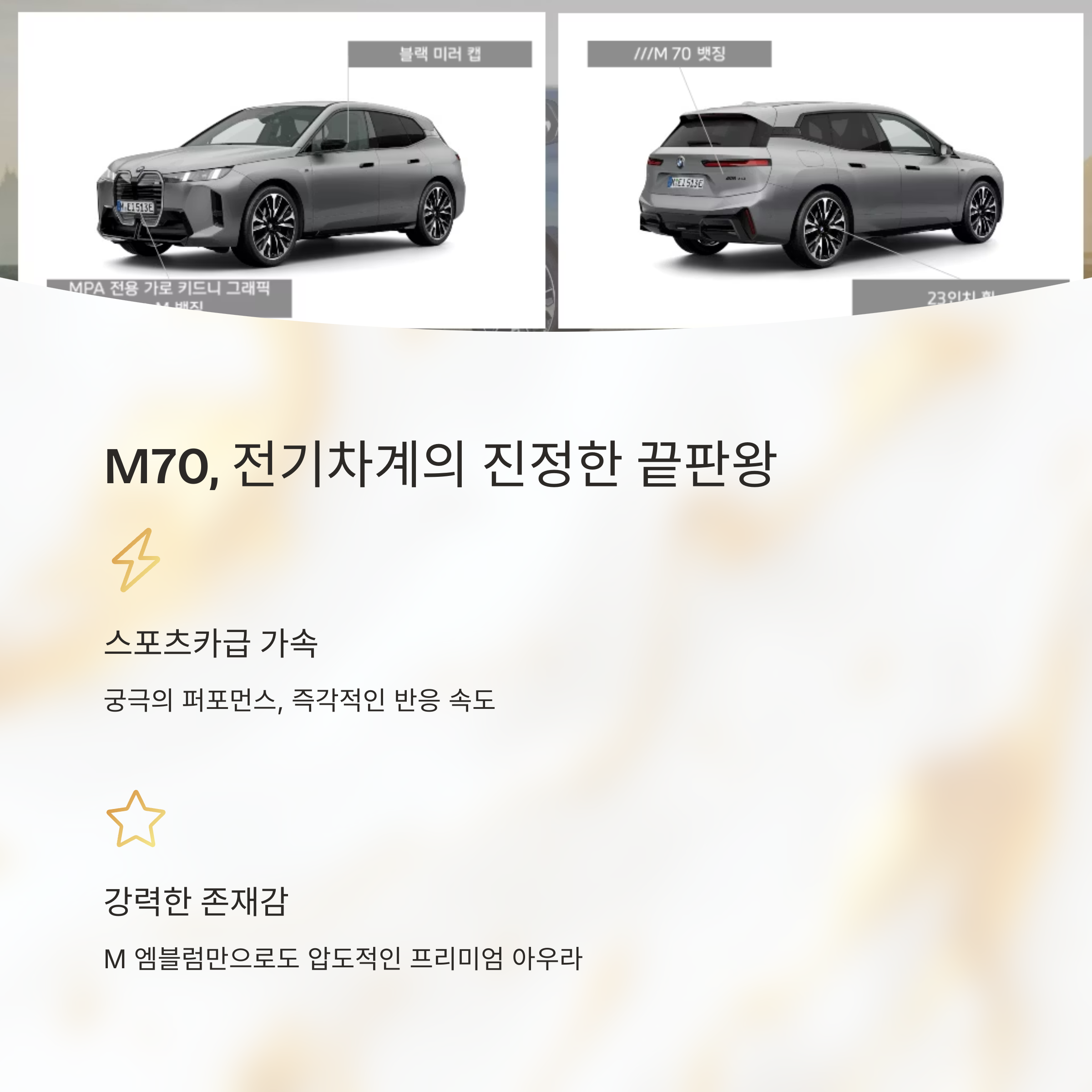 iX M70 xDrive는 말 그대로 궁극의 퍼포먼스를 보여주는 모델이에요.