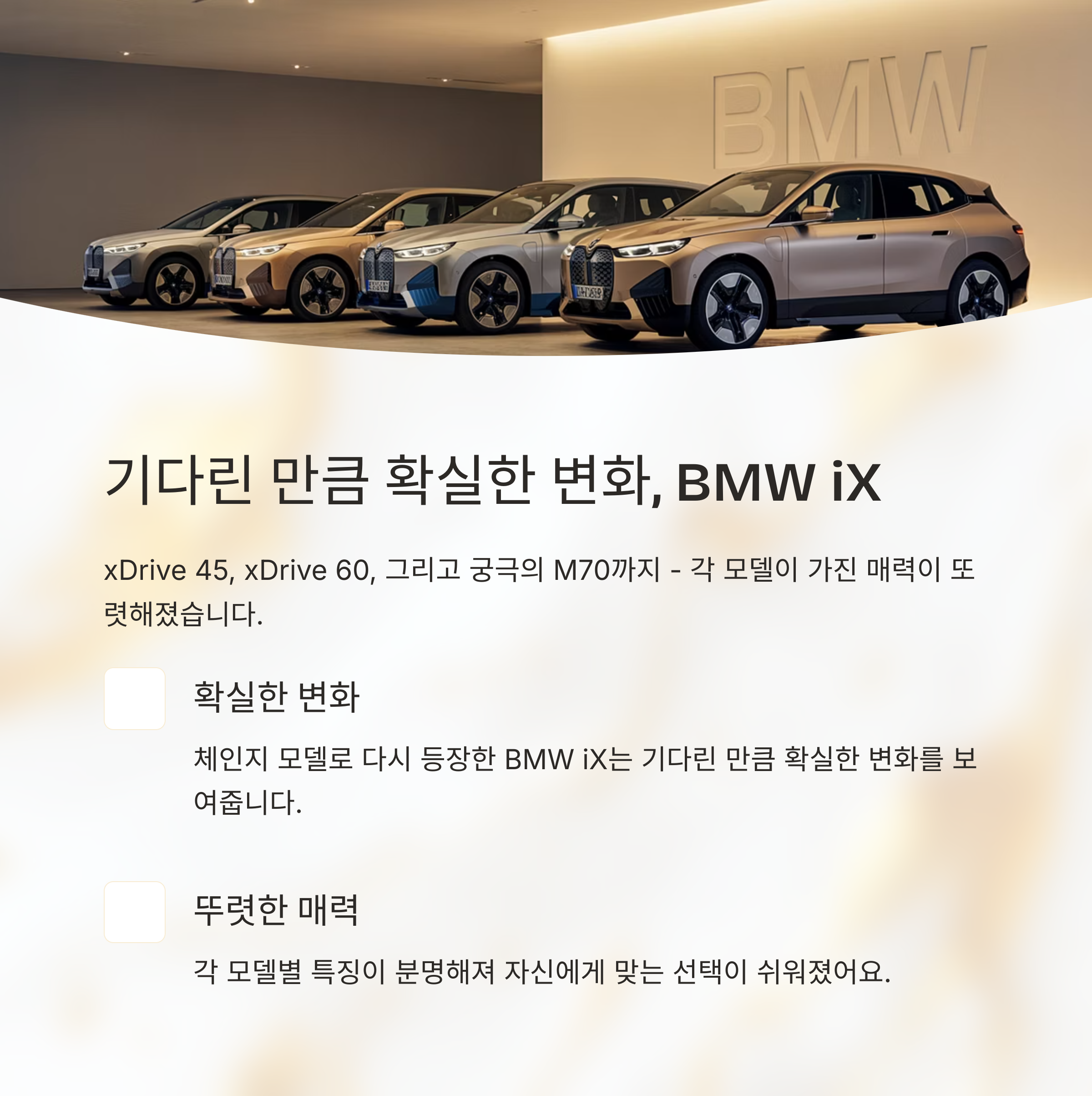 BMW iX가 체인지 모델로 다시 등장했습니다. 기다린 만큼 변화는 확실했고, 직접 보고 나니 망설일 이유가 없었어요. xDrive 45, xDrive 60, 그리고 궁극의 M70까지, 각 모델이 가진 매력이 또렷해진 지금, 왜 많은 사람들이 이 시점에 BMW iX를 선택했는지 그 이유를 공유해볼게요.