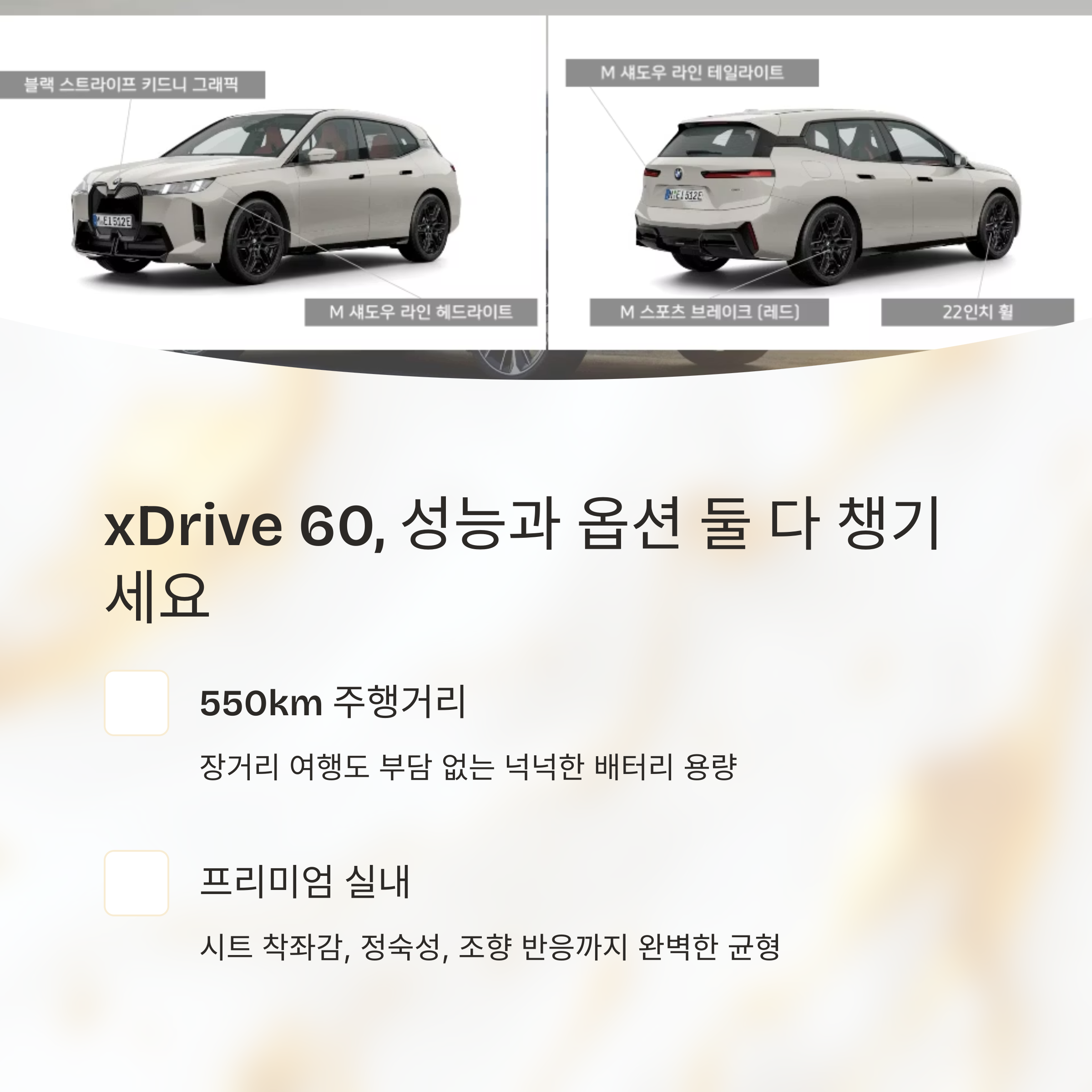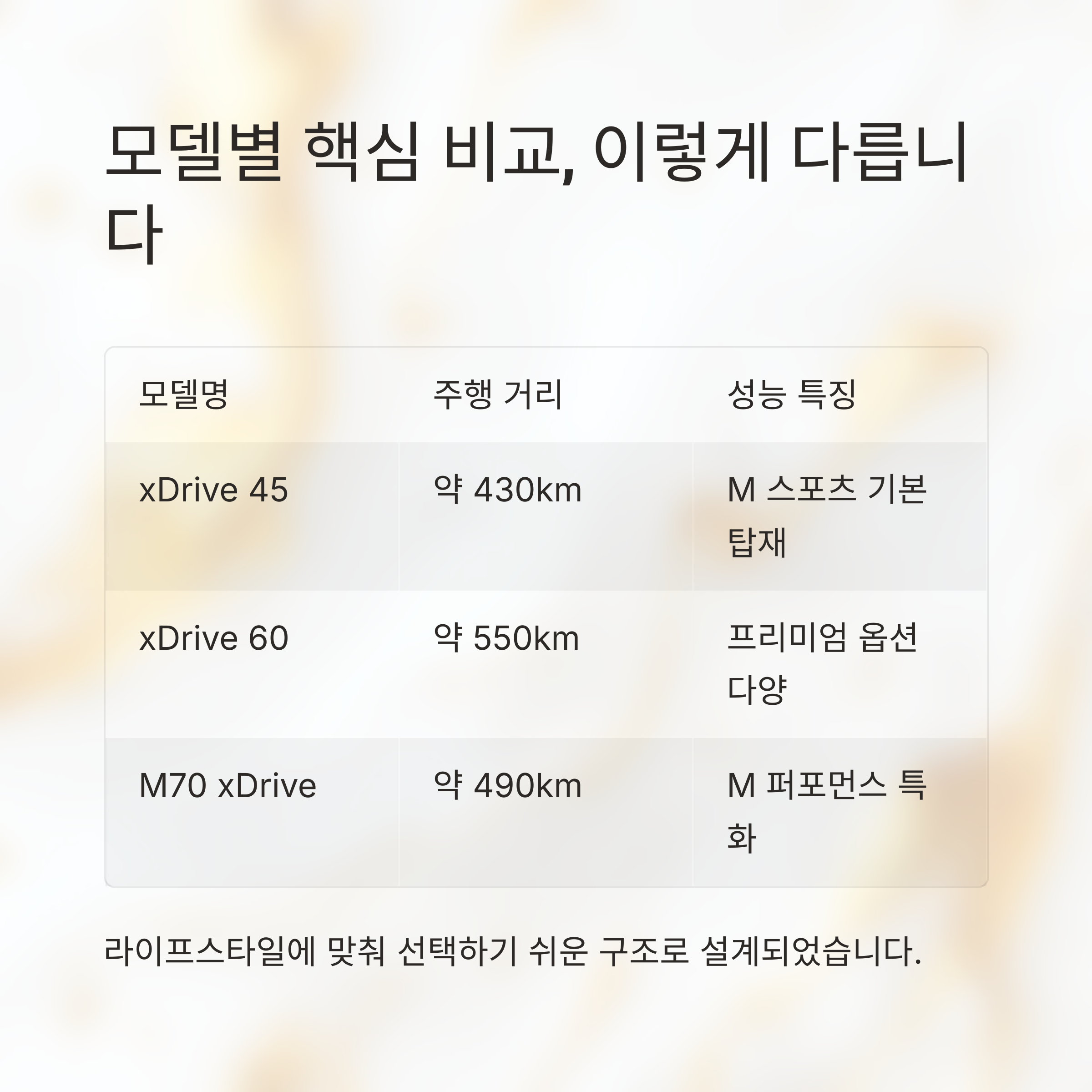 | xDrive 60 | 약 550km | 여유로운 퍼포먼스 | 프리미엄 옵션 다양 |