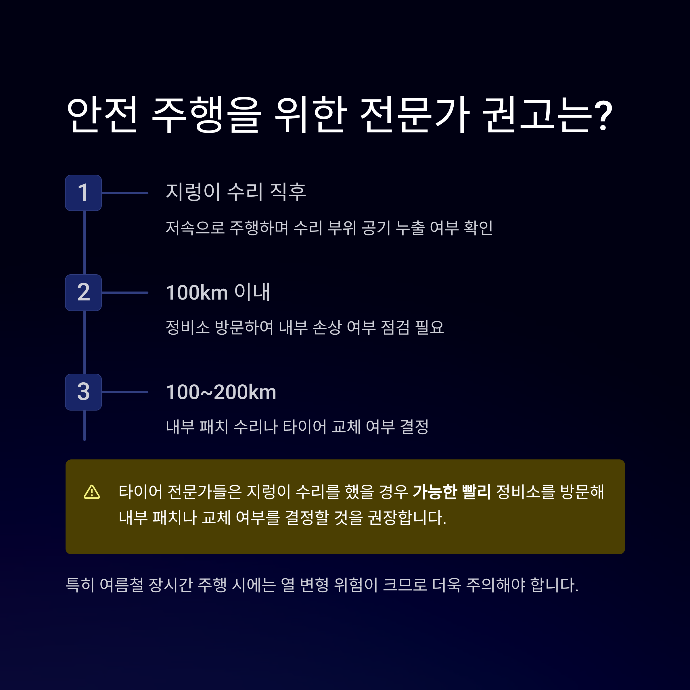 특히 여름철 장시간 주행 시 열 변형 위험이 큽니다.