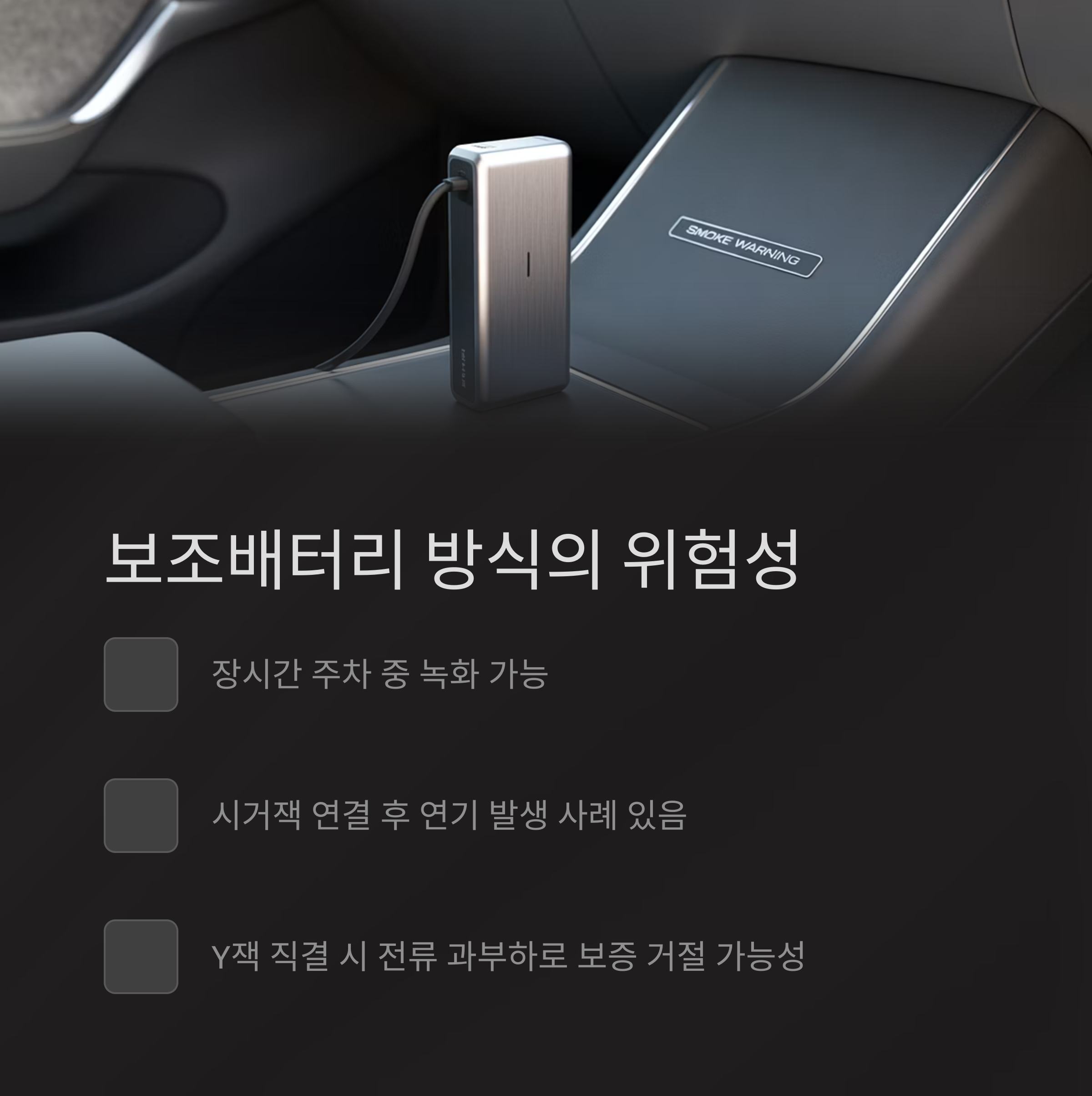 | 보조배터리+시거잭 | 가능 | 이동성, 보조전원 확보 가능 | 화재 위험, 배선 문제, 보증 이슈 발생 가능성 |