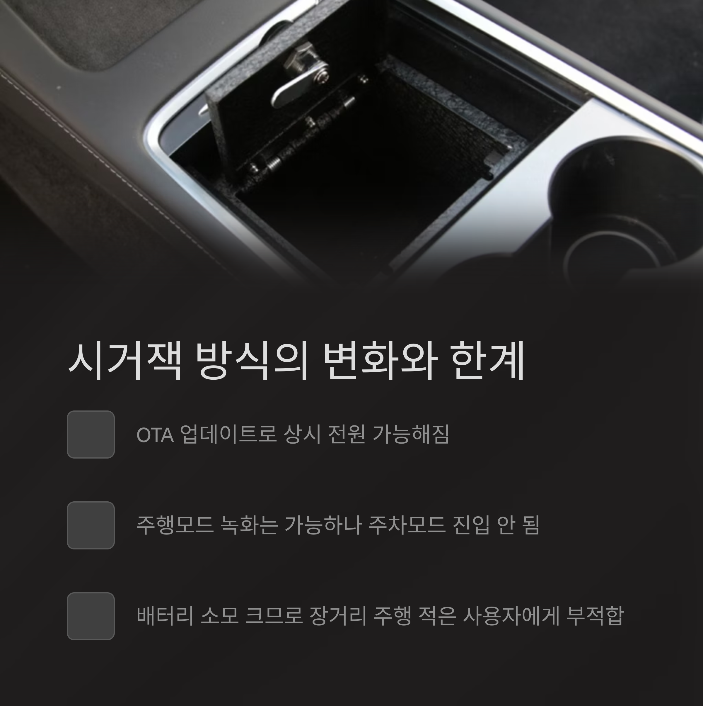| 시거잭(센터콘솔) | 부분 가능 | 설치 간단, 업데이트로 주행모드 가능 | 주차모드 미진입, 배터리 소모 큼 |