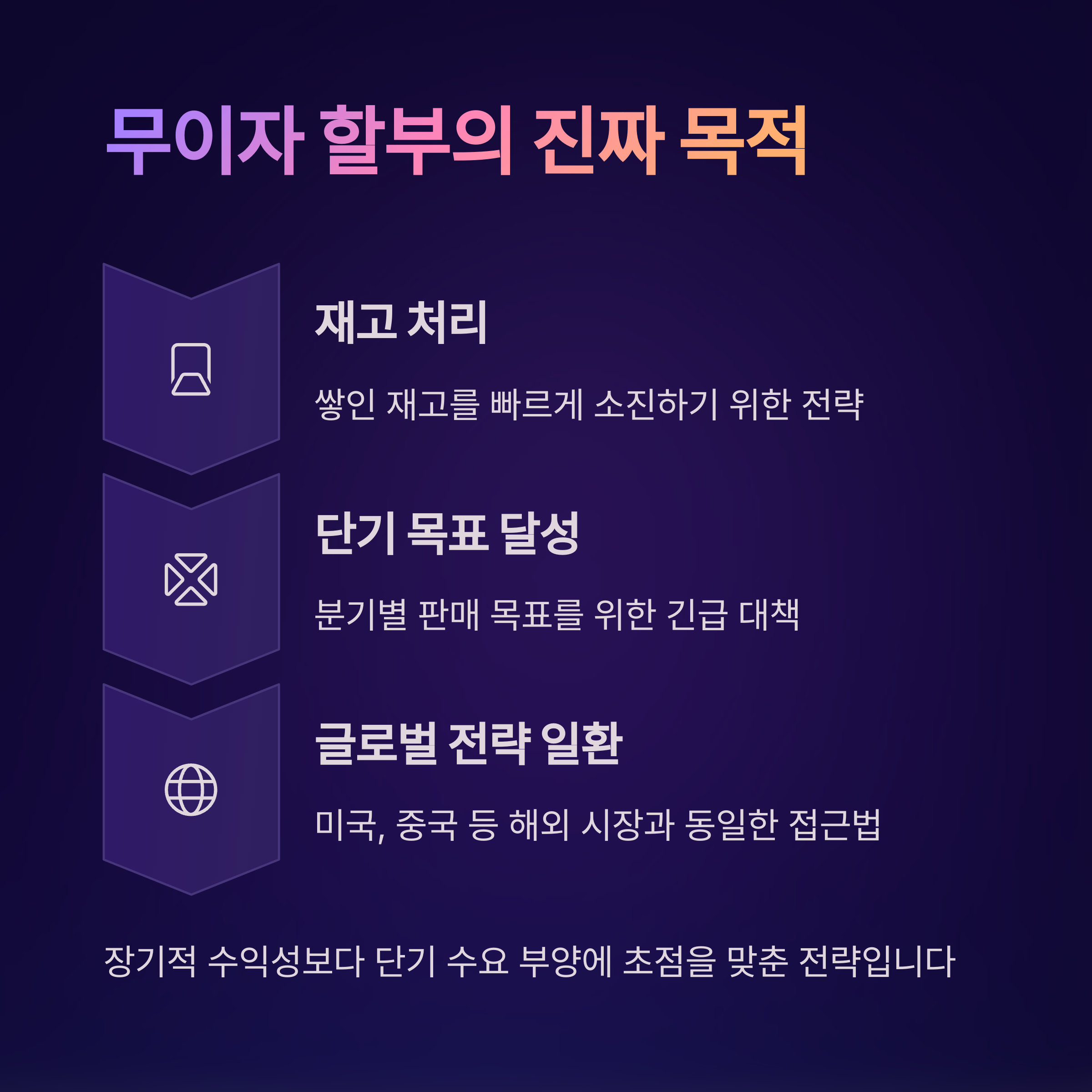 결국 재고 처리와 단기 목표 달성에 초점이 맞춰진 전략입니다.