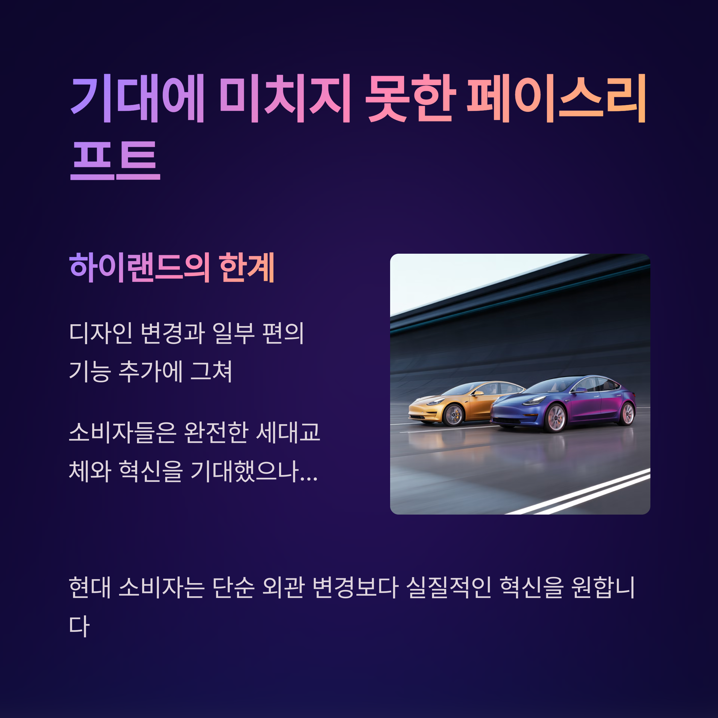 소비자들은 단순한 외관 변경보다는 확실한 혁신을 요구하고 있는 상황입니다.