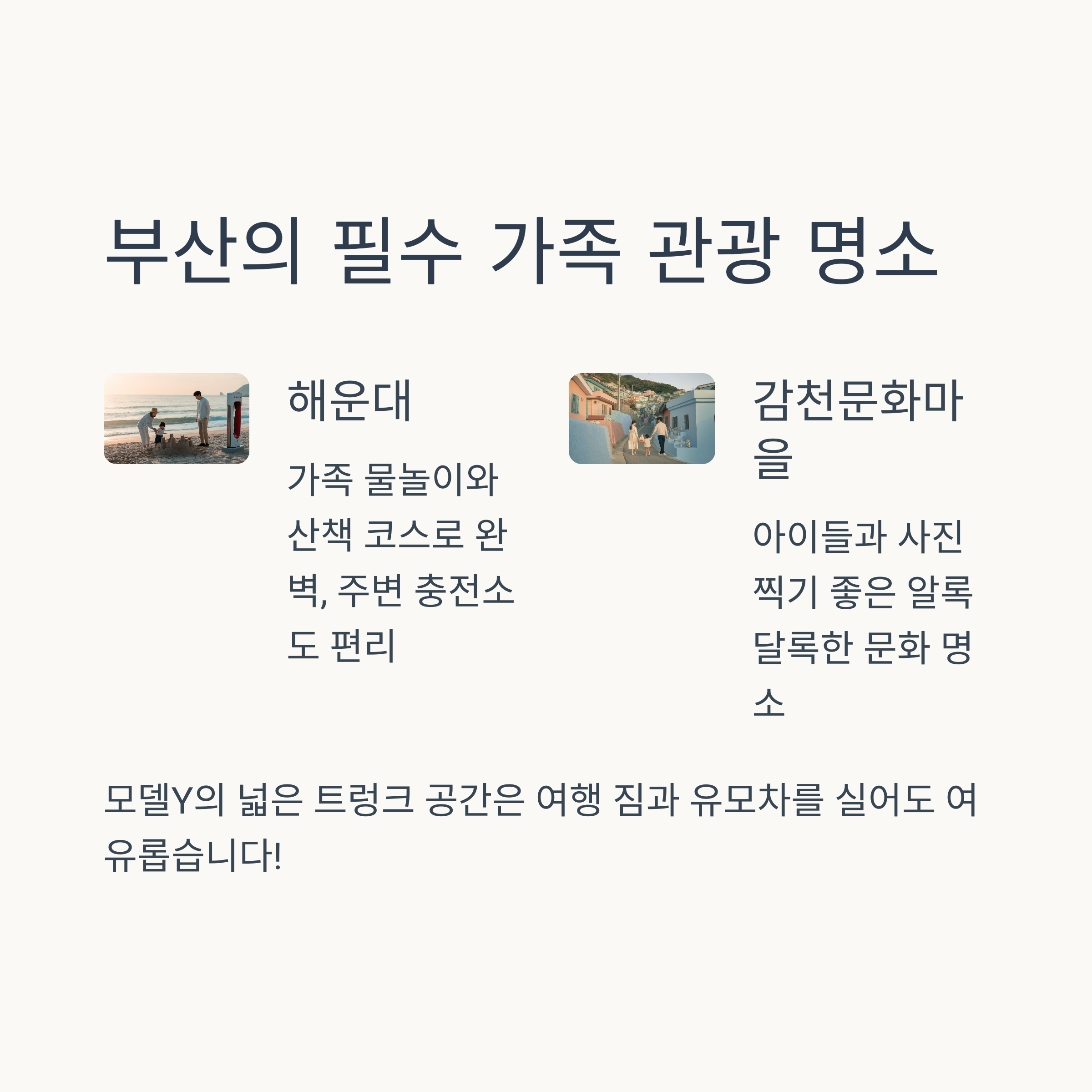 부산 도착 후엔 해운대, 광안리, 감천문화마을 등 가족이 함께 즐길 수 있는 명소가 다양합니다. 특히 감천문화마을은 아이들과 사진 찍기 좋고, 해운대는 여름철 물놀이까지 가능해 여름 가족 여행의 완성판이 됩니다.