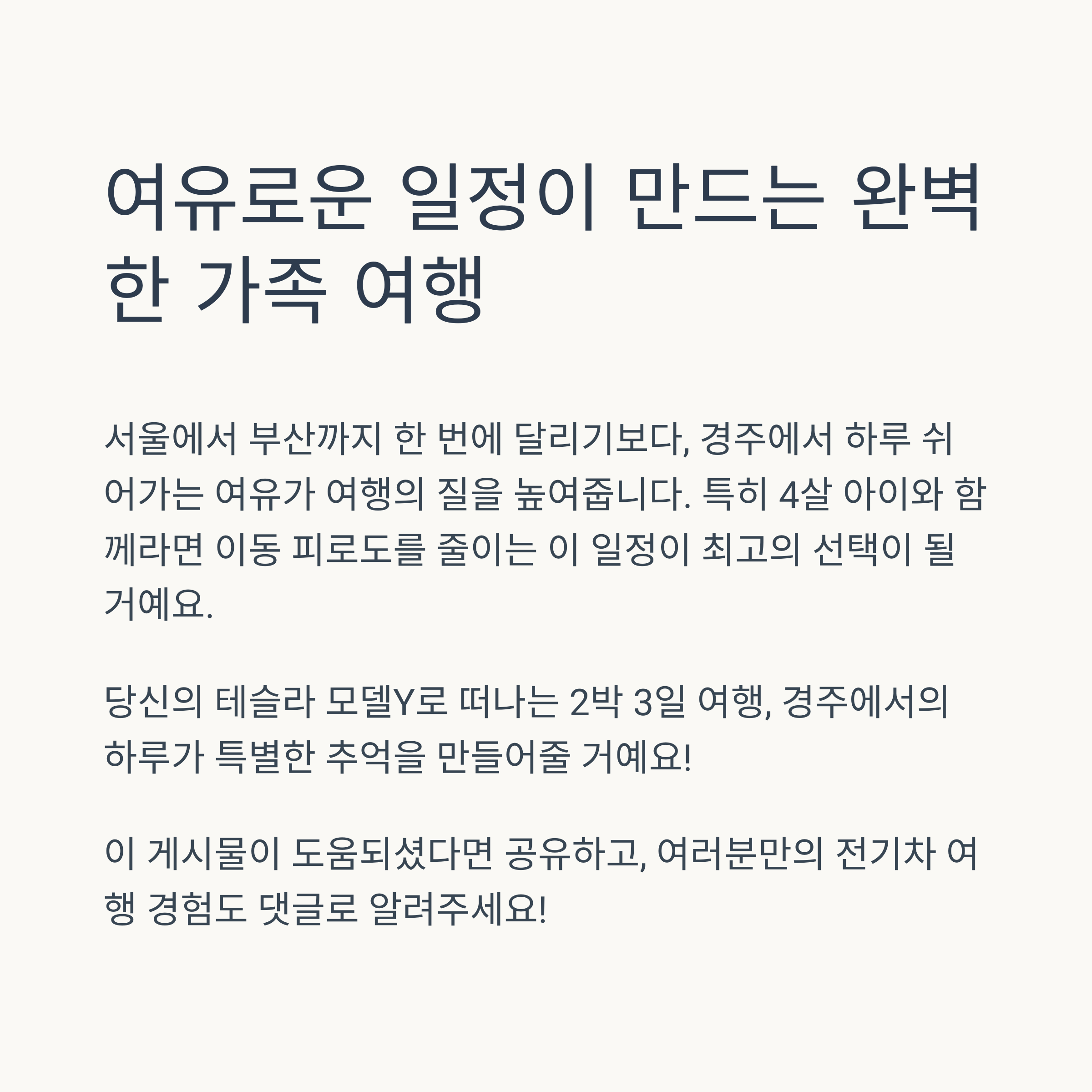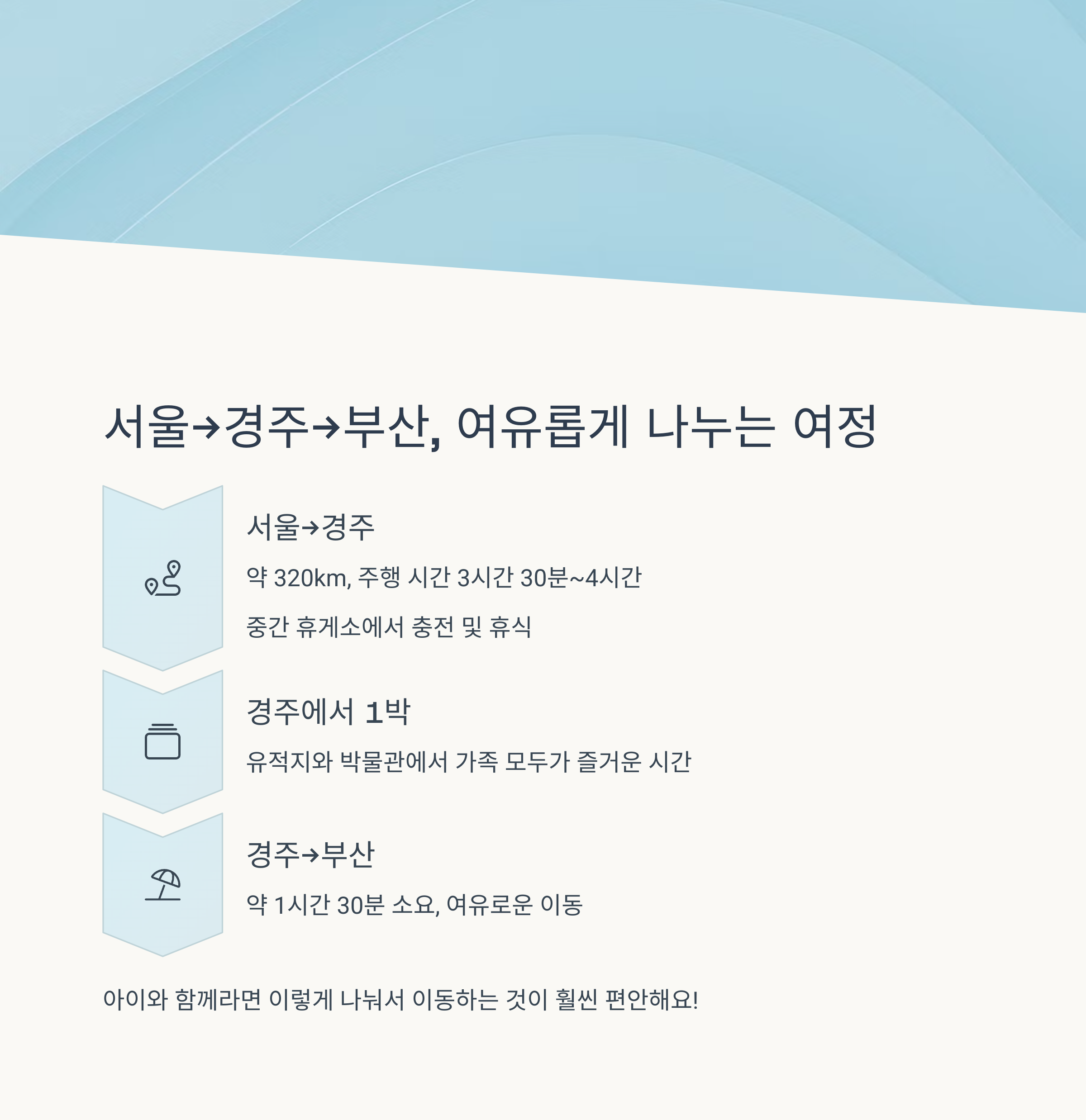 서울에서 부산까지 전기차 여행을 계획 중이시라면, 중간에 경주에서 하루 머무는 일정을 추천드립니다. 특히 아이가 있는 가족 여행이라면 더 여유롭고 알찬 여행이 가능해집니다. 이동 경로, 예상 비용, 충전 계획까지 모두 꼼꼼히 분석해 드립니다.